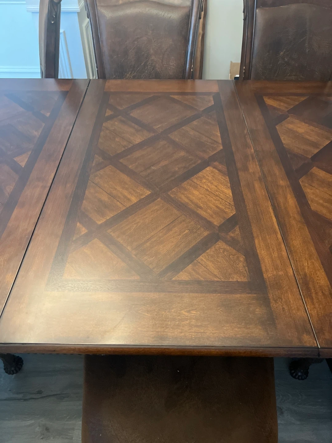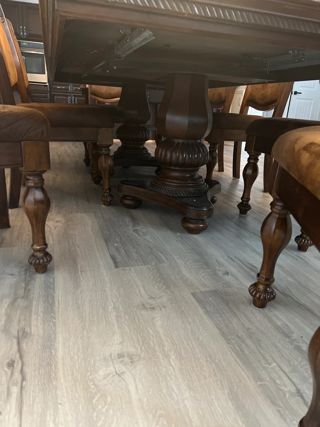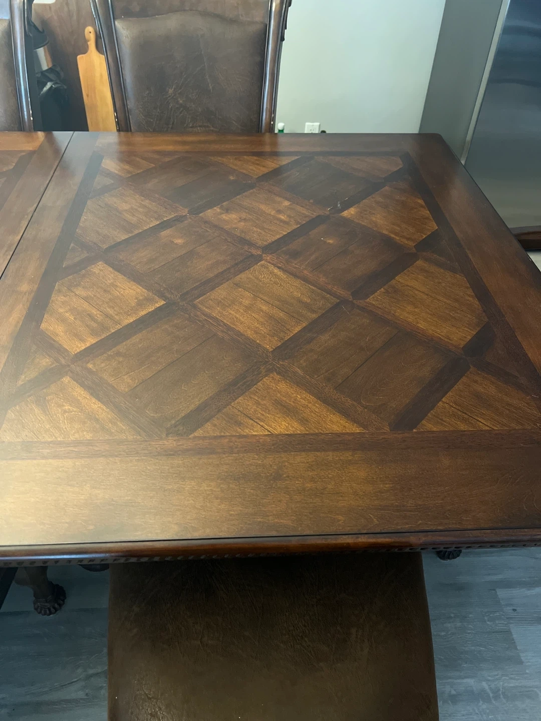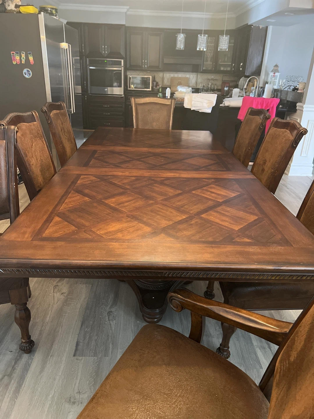 Selling a dining table with 8 chairs. The set is brown and features a decorative design on the table and chairs. It's a beautiful set for a large dining room
