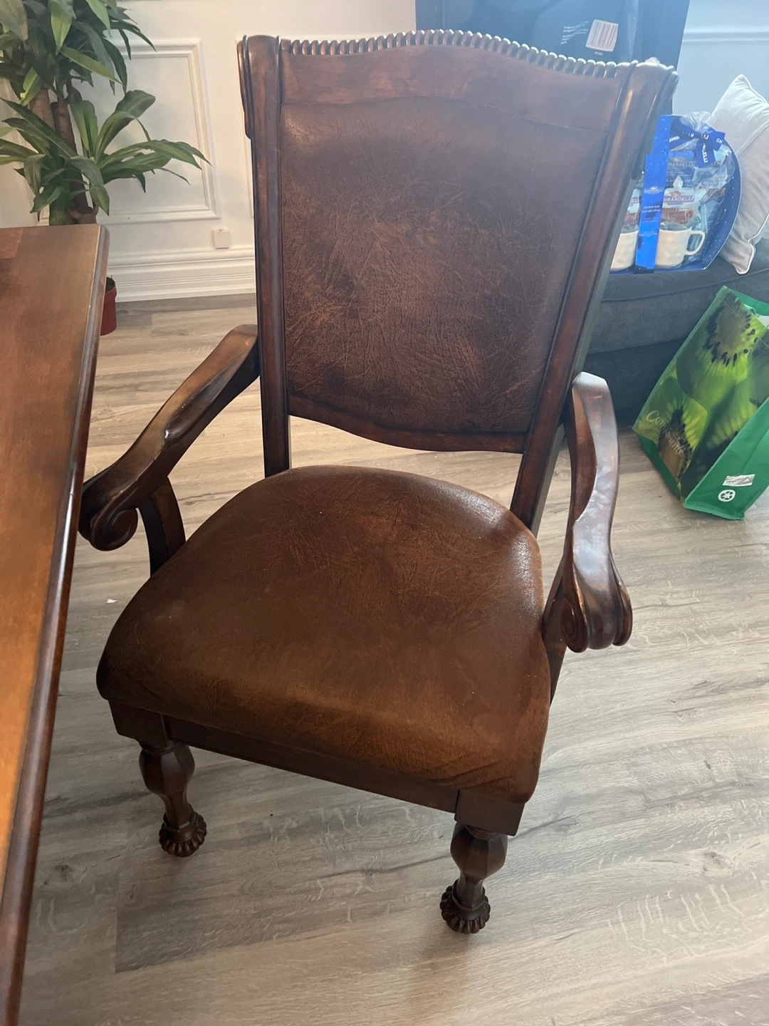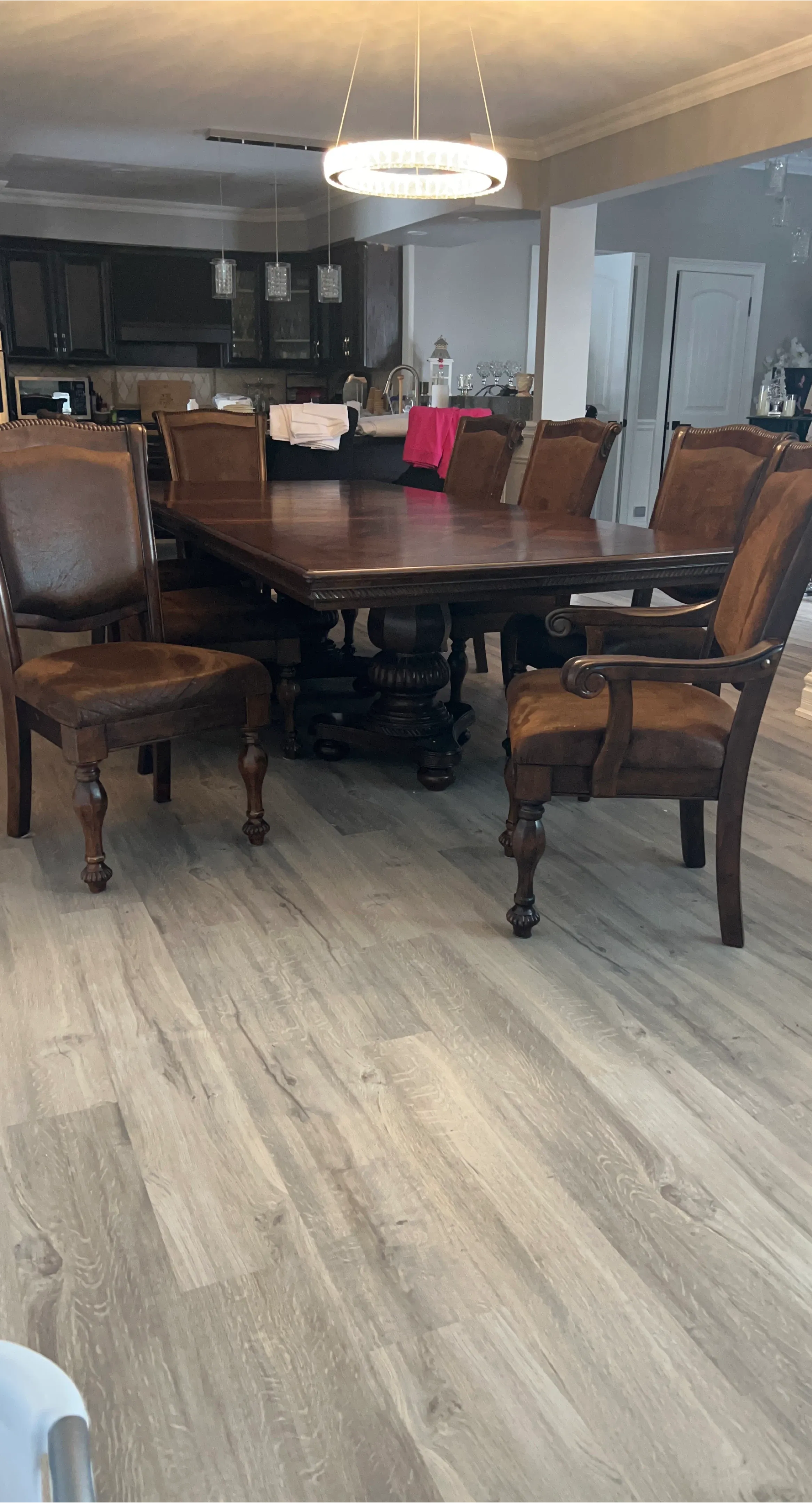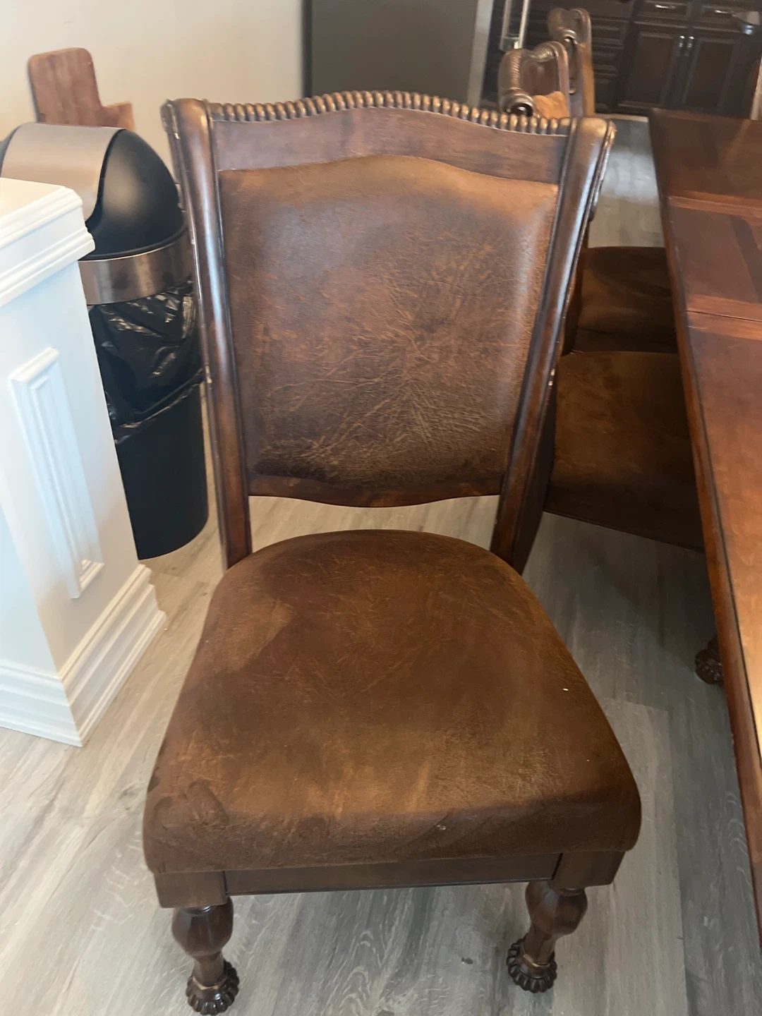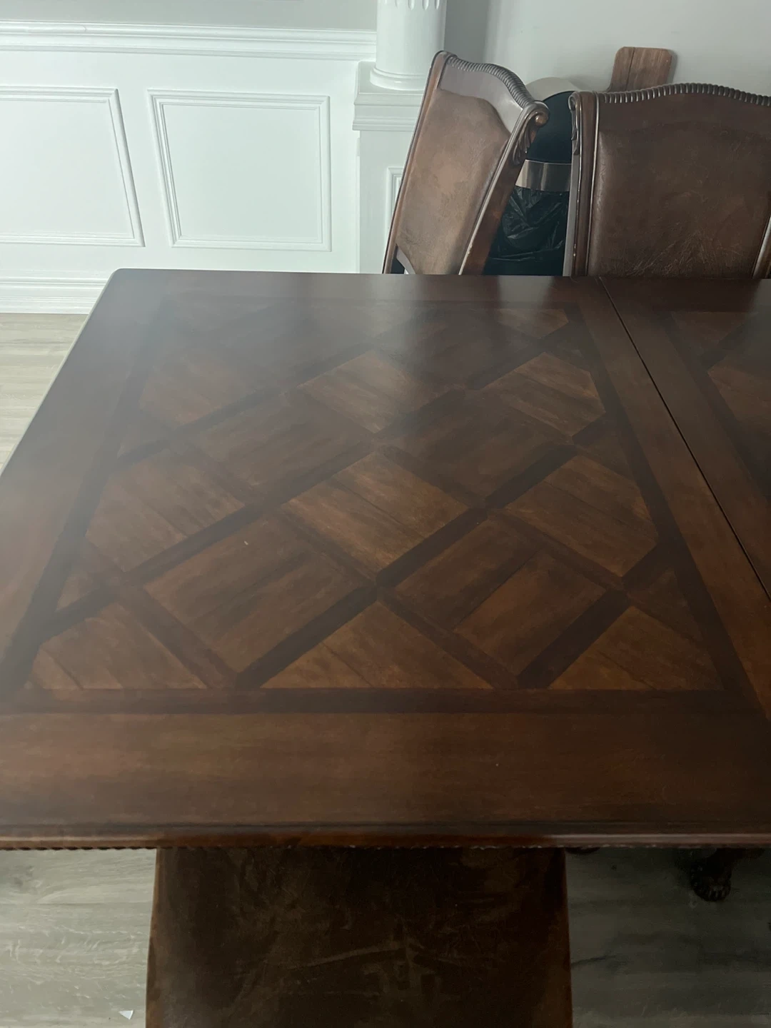 Selling a dining table with 8 chairs. The set is brown and features a decorative design on the table and chairs. It's a beautiful set for a large dining room