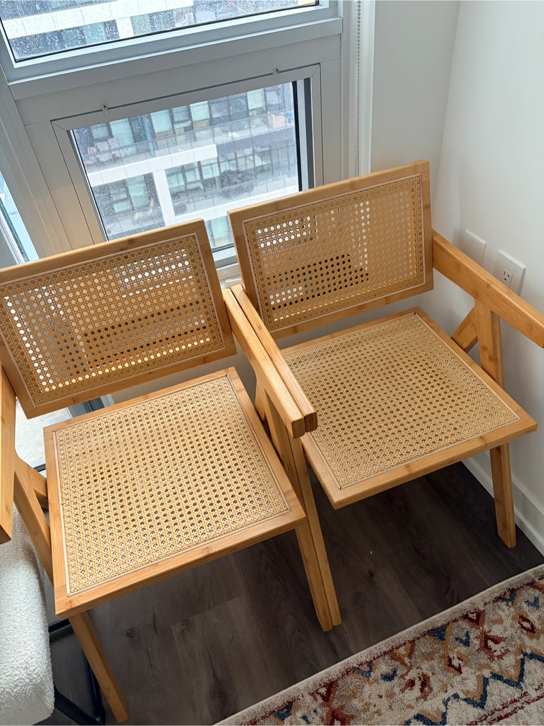 Selling a set of two rattan accent chairs. These are in great condition and would look lovely in any space! The natural wood and woven rattan seat give off a warm and inviting feel.