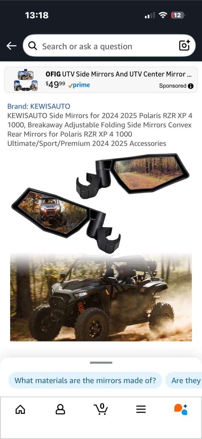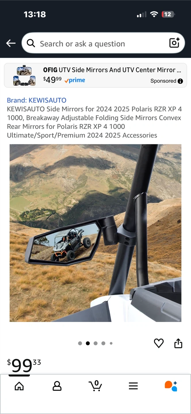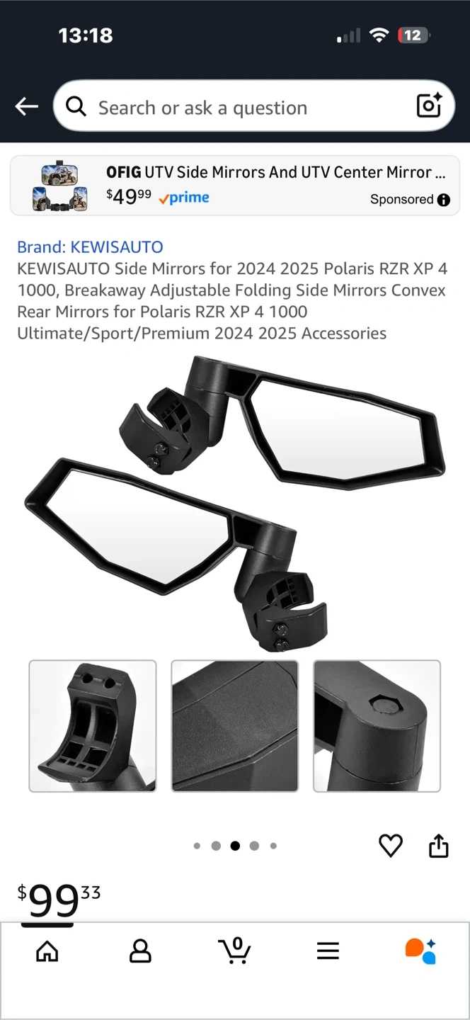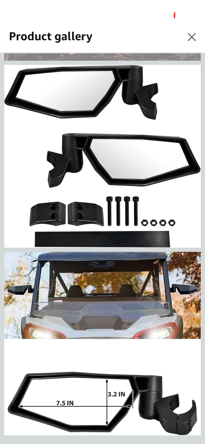 Selling a set of KEWISAUTO side mirrors designed for the 2024-2025 Polaris RZR XP 4 1000. These are breakaway adjustable folding side mirrors, offering both convenience and safety. They provide a convex rear view for improved visibility.