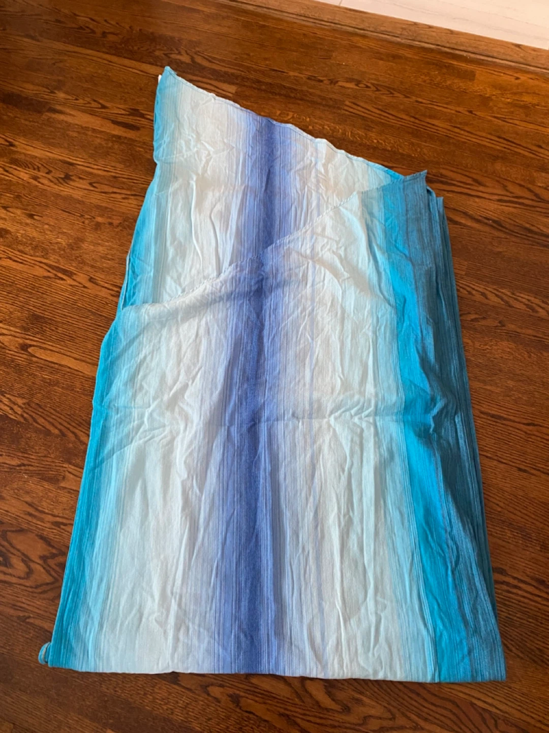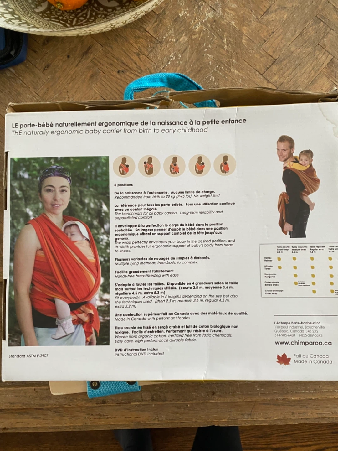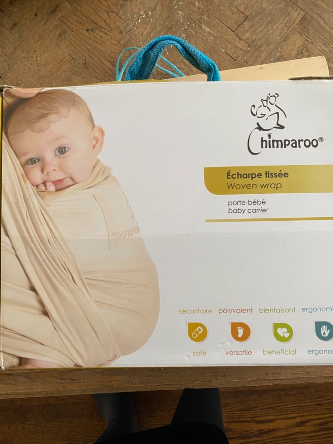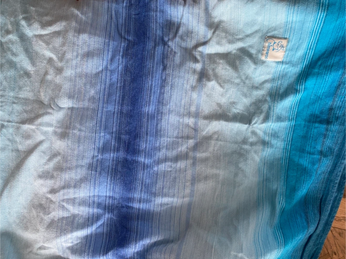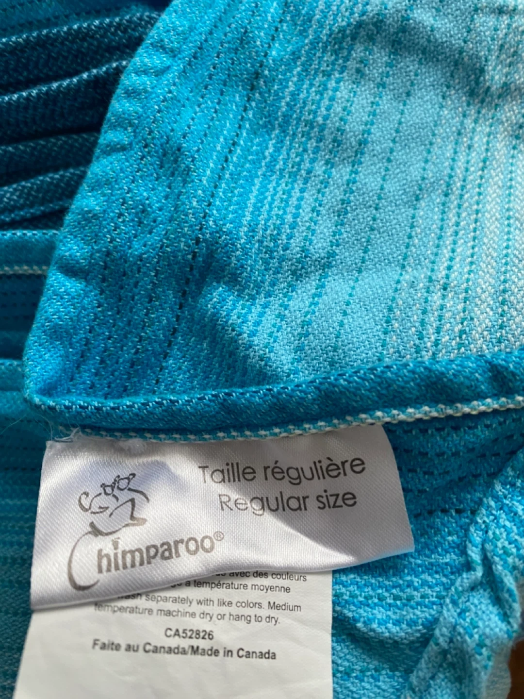 Selling a Chimparoo woven baby wrap in regular size! It's in great condition and perfect for keeping your little one close. The wrap is a beautiful blue and white gradient colour. Made in Canada! Selling with original box, instructions and a set of rings so that it can be converted into a ring sling as well. It has been freshly laundered and is ready for a new home.