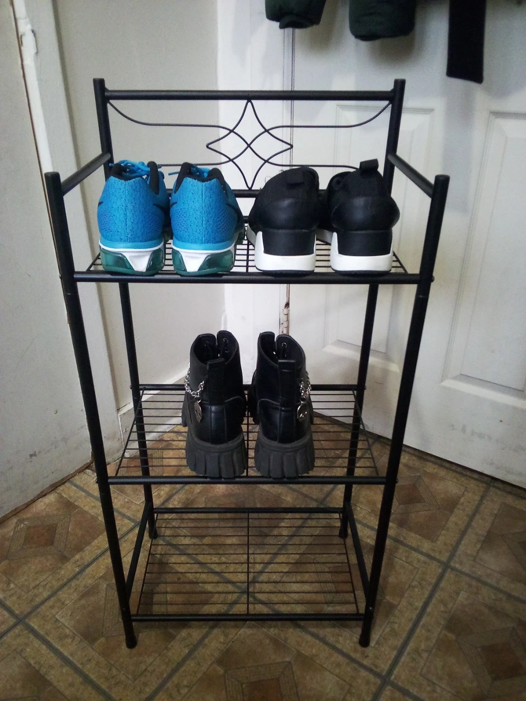 Selling a black metal shoe rack with three tiers! It's perfect for organizing your shoes and keeping them off the floor. It has a simple design that fits well in any space. You could also disable it I for travel with just a screwdriver.