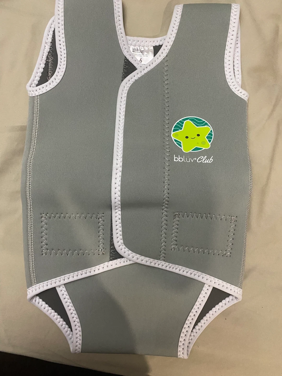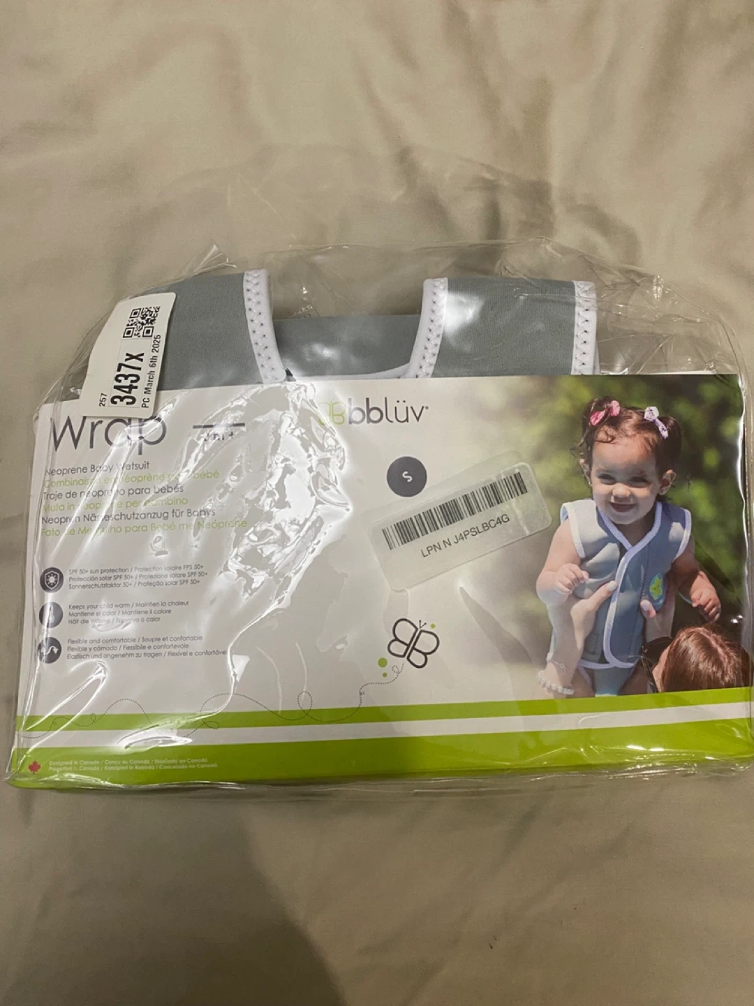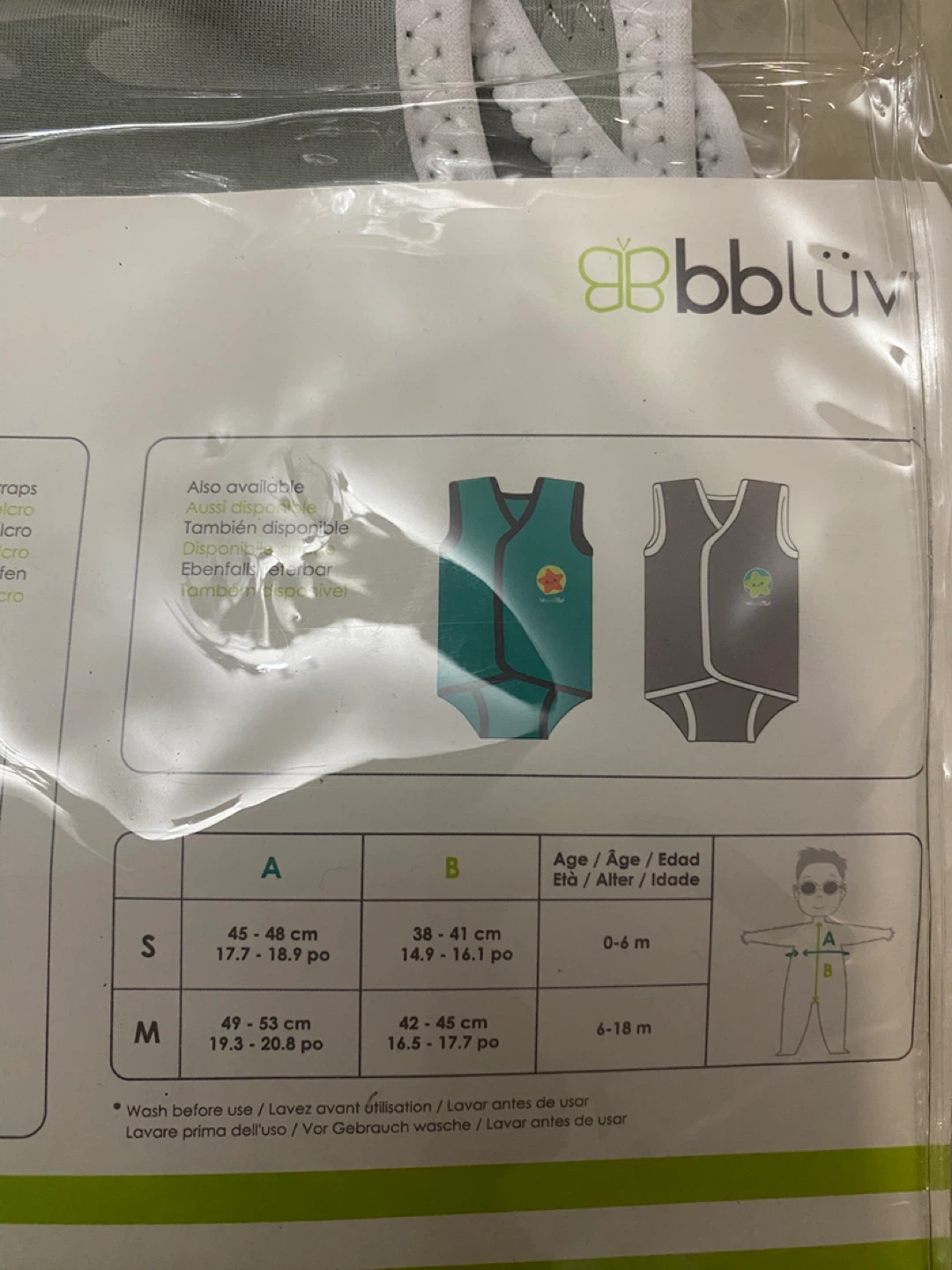 Selling a NEW bblüv Wrap Neoprene Baby Wetsuit in size S, suitable for babies aged 0-6 months. It's lightweight, soft, and washable, made of neoprene. This wetsuit opens flat to make dressing easier! Great for keeping your little one comfortable during water activities. Also included us a pair of very lightly used bbluv shoes sz5-6.