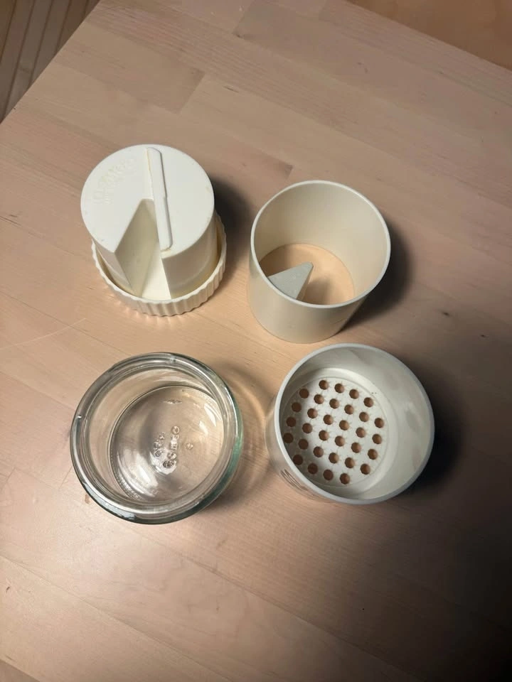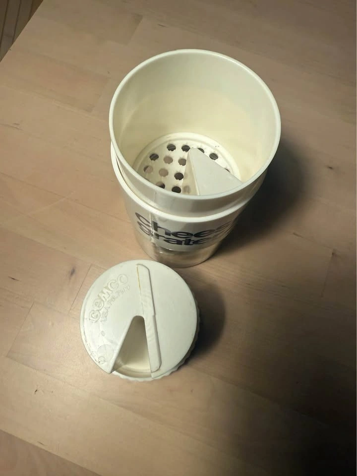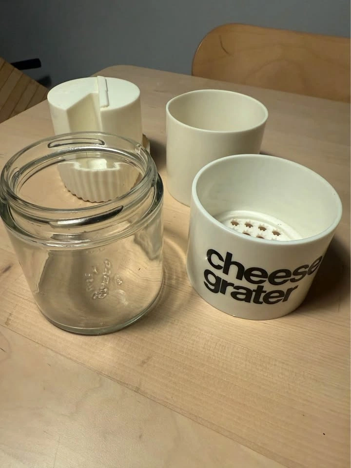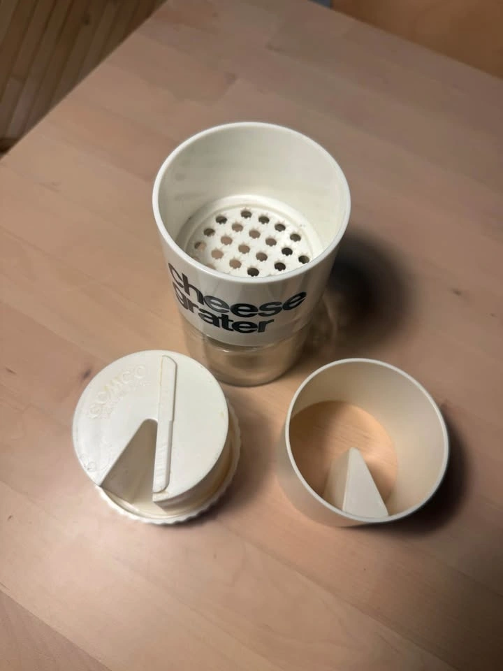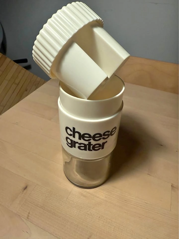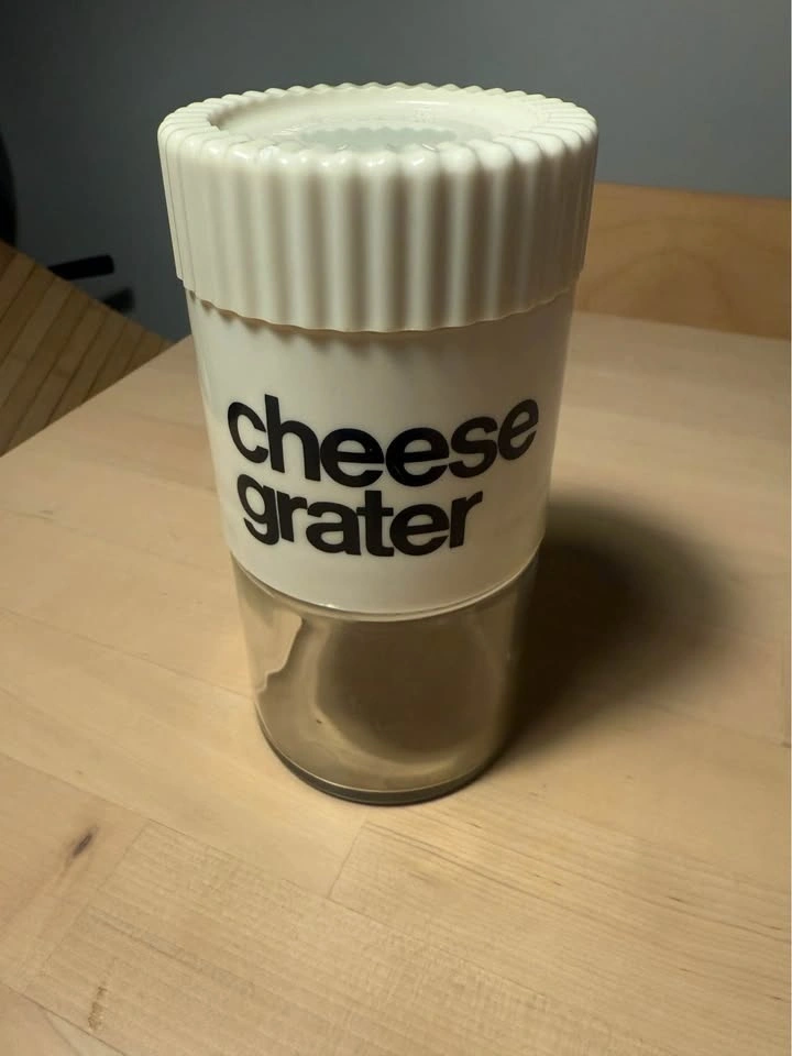 It was designed to grate cheese for dishes like spaghetti, salads, and soups.