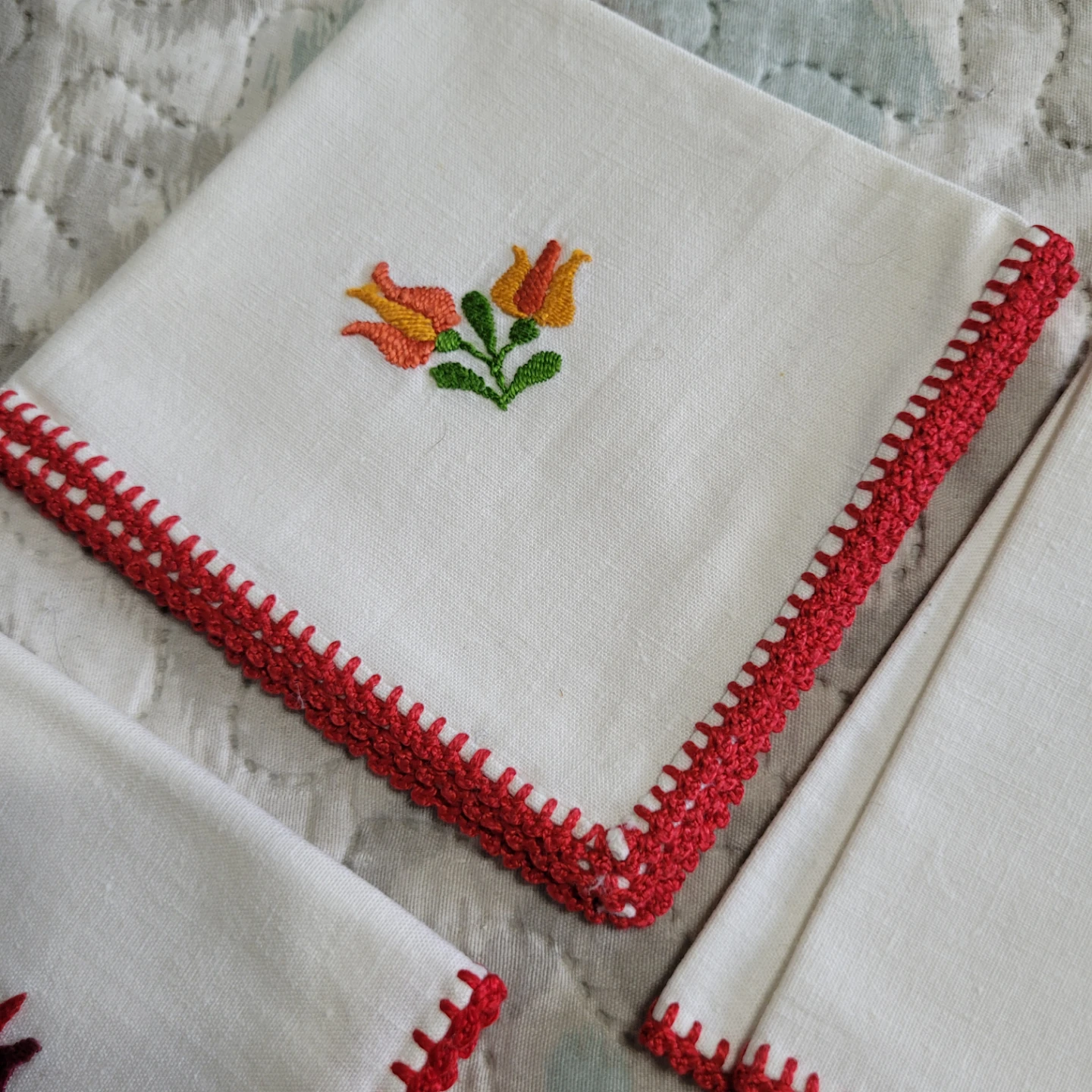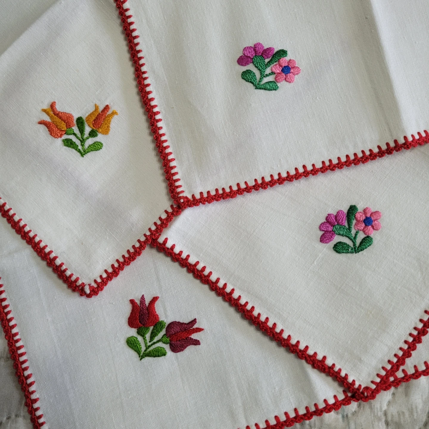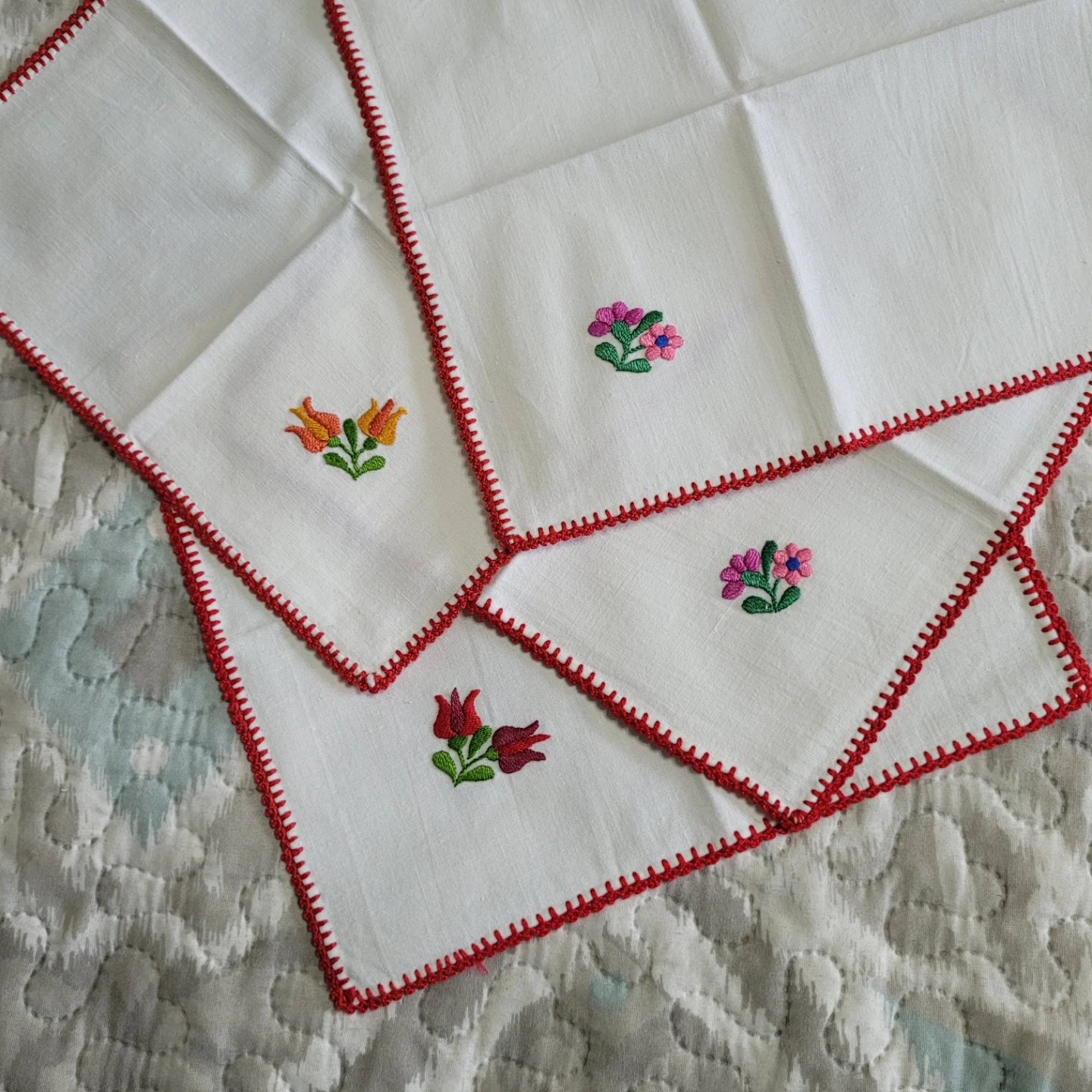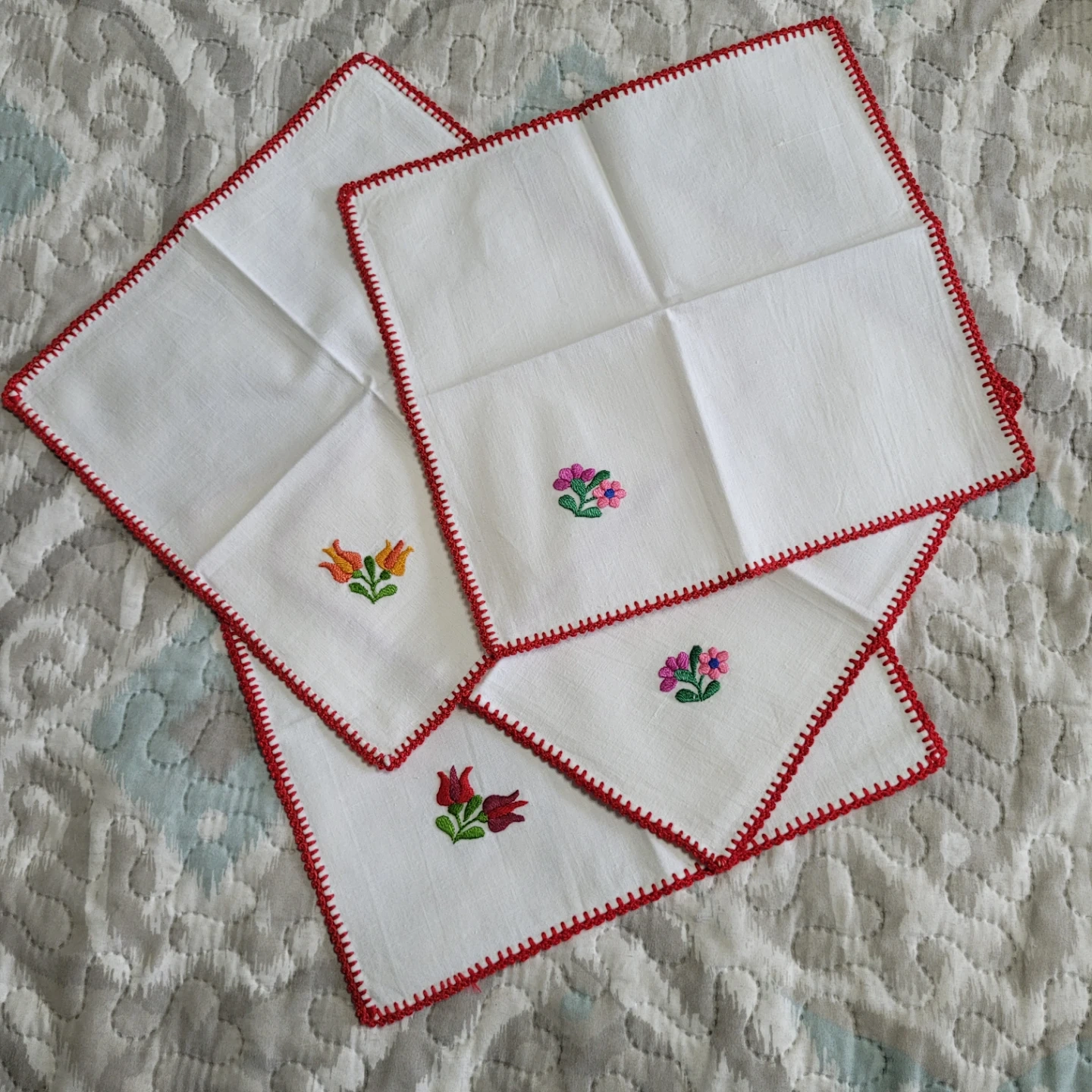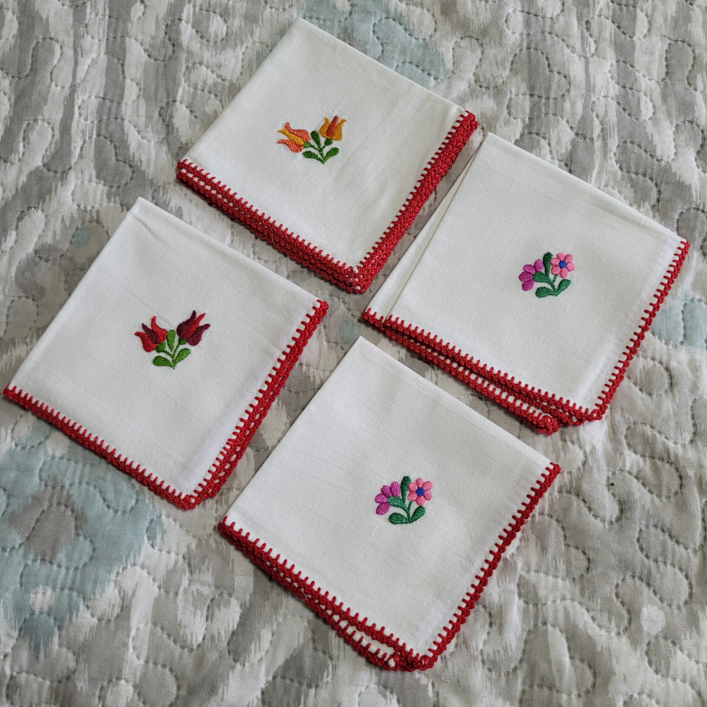 Beautiful Vintage Set of 4 Floral Linen Napkins Embroidered