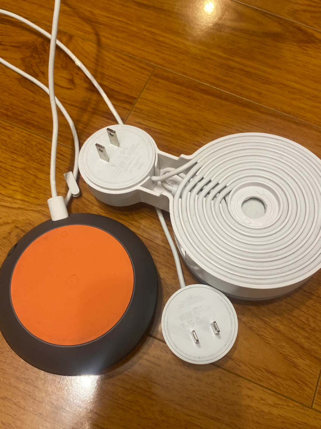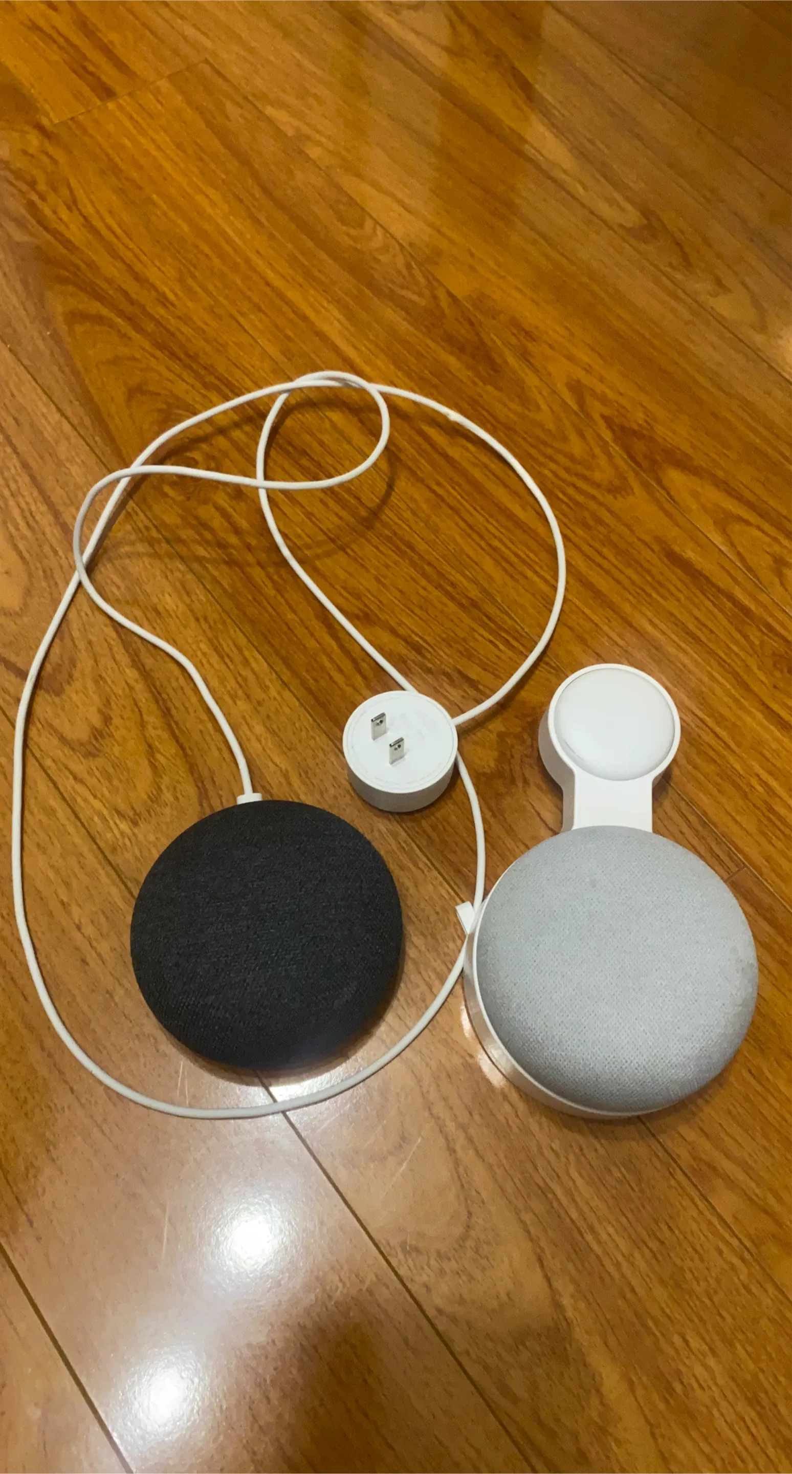 Dark charcoal is Google Home Mini 1st gen. Light chalk is Google Nest Mini 2nd gen. Comes with power adapters and Nest comes with a Free wall holder.
