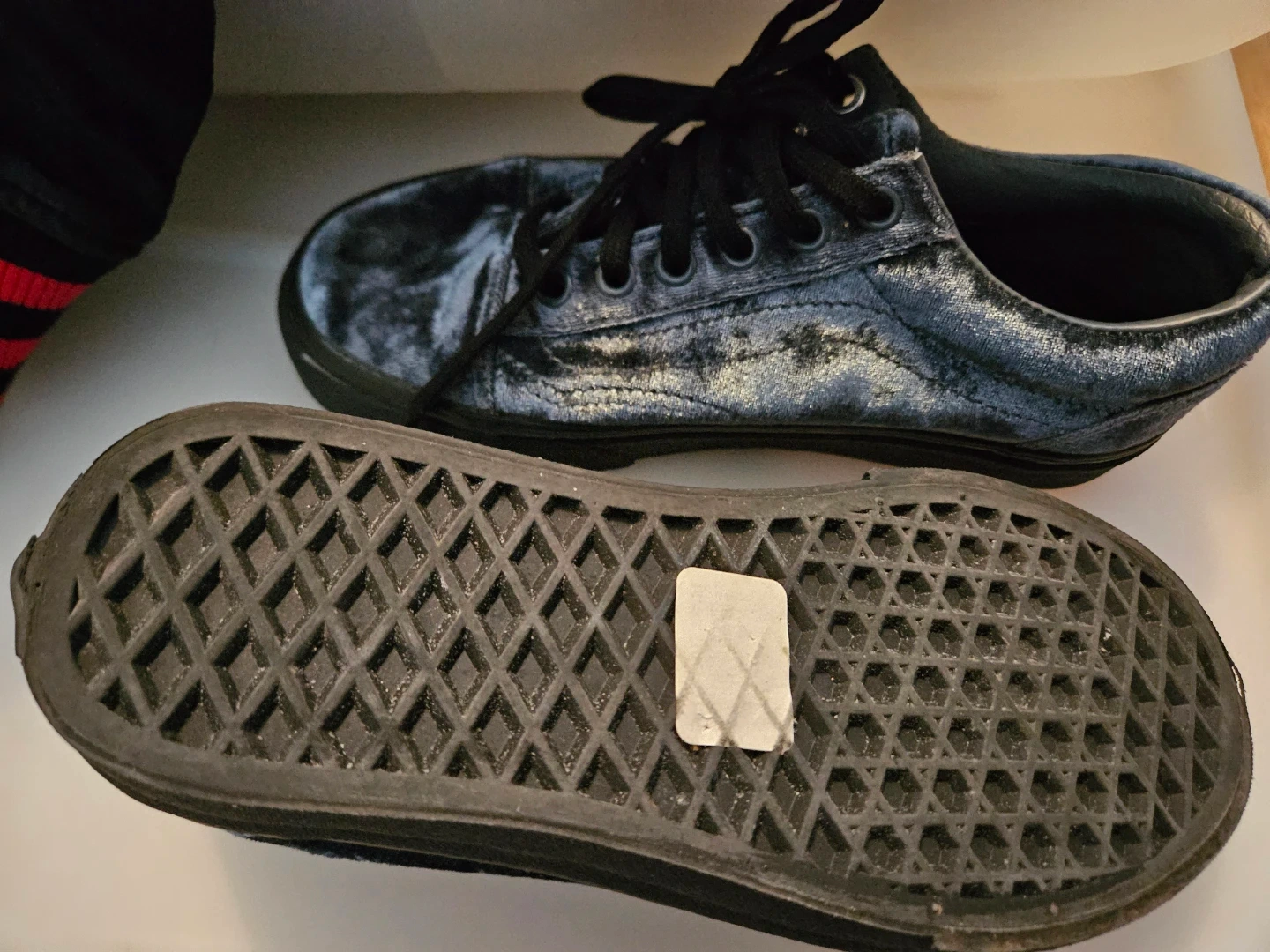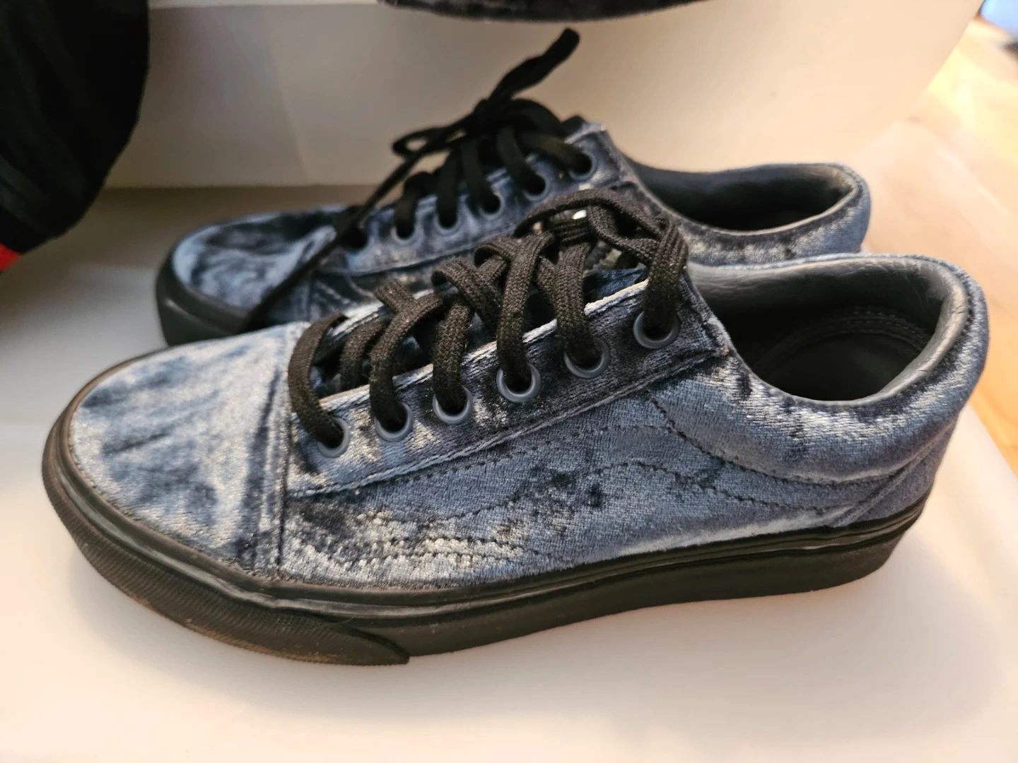 Selling a pair of Vans Old Skool sneakers in a cool blue velvet! They're in good condition (only worn once) and ready for a new owner to show them the love the deserve.. Perfect for adding a unique touch to your casual outfits!