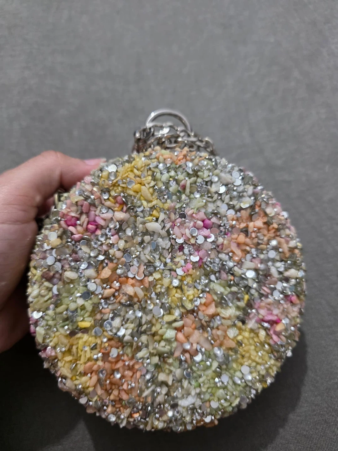 Check out this eye-catching round clutch, perfect for adding a bit of sparkle to any outfit! It's covered in colourful rhinestones and has a chain strap. It's in great condition and ready for a night out!