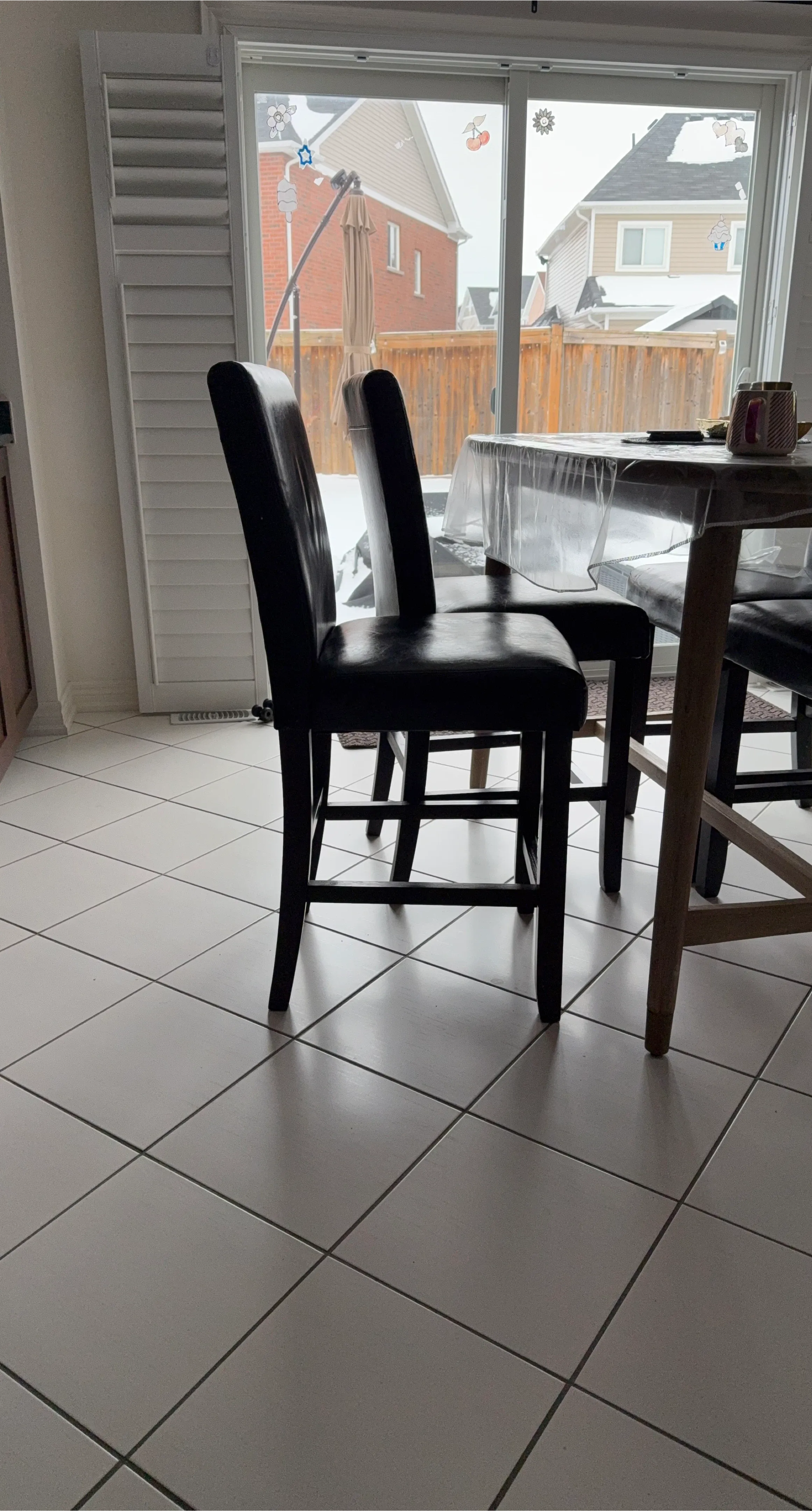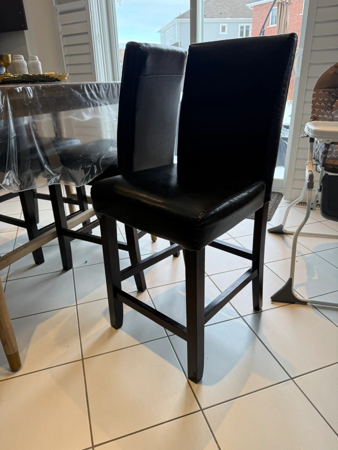 Selling a set of four black bar stools. They're in good condition and would look great in any kitchen or bar area. Black faux leather with dark brown wood legs.