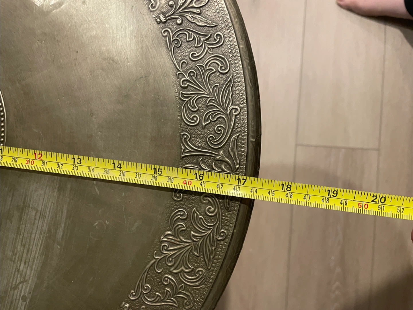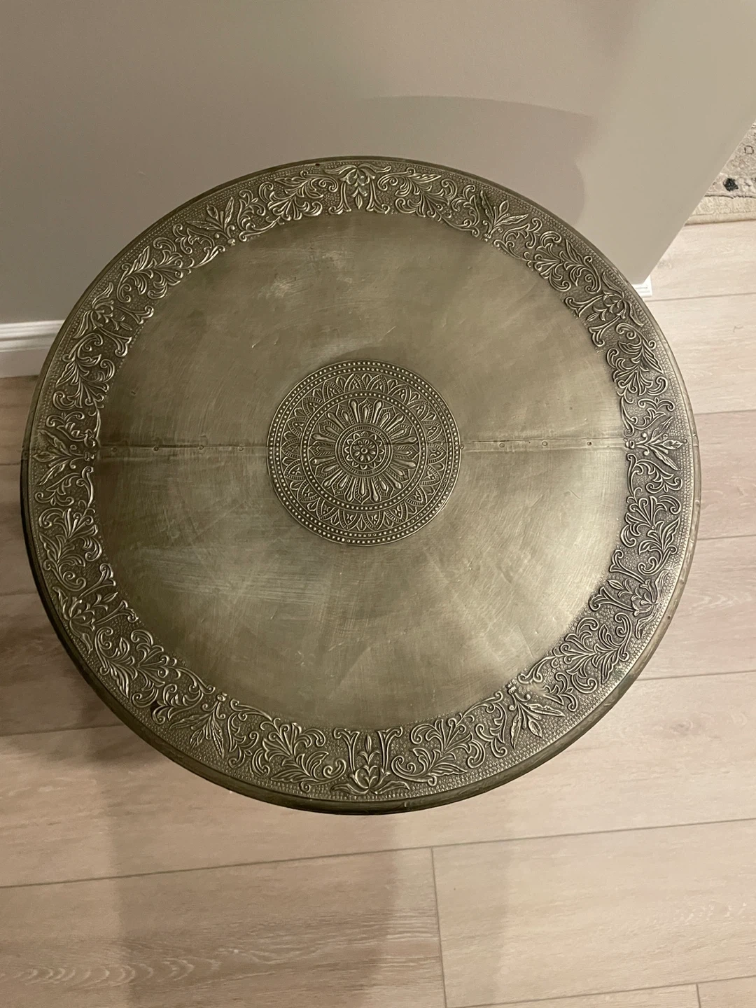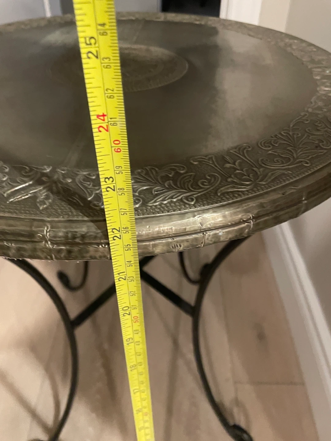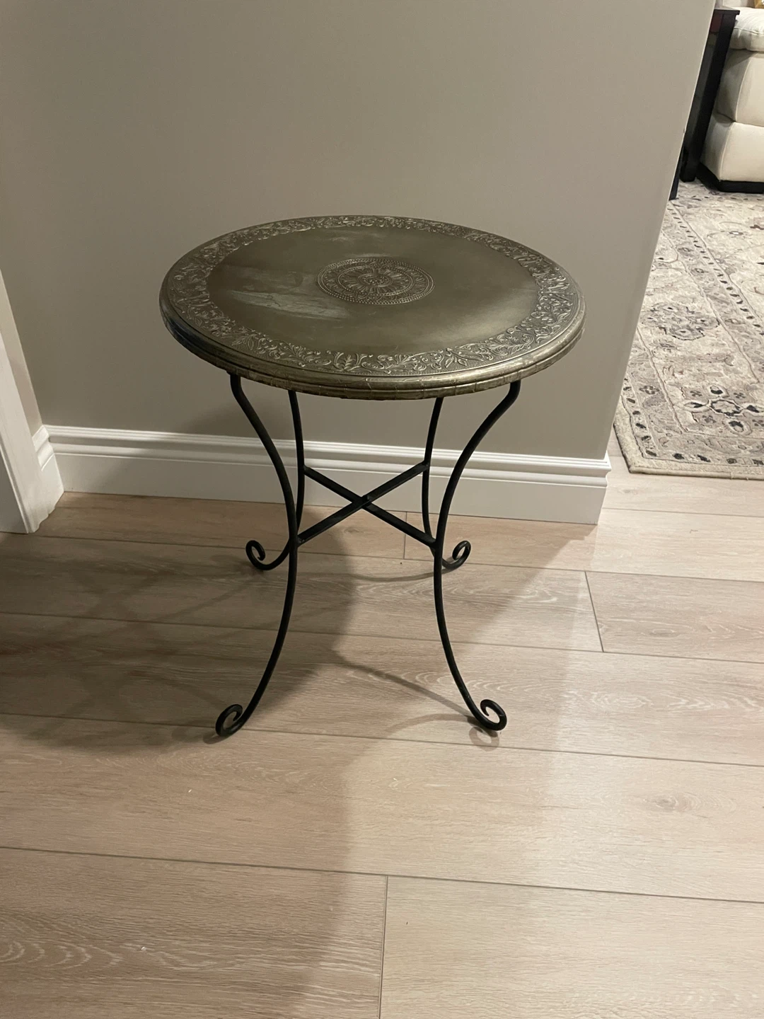 Selling a unique round accent table! It features a decorative top with intricate designs. Top is wood covered in a metal- look coating. Small imperfections. Sturdy black metal base. The tabletop is approximately 17 inches in diameter, and the table stands about 22 inches tall. It's perfect for adding a touch of elegance to any room!