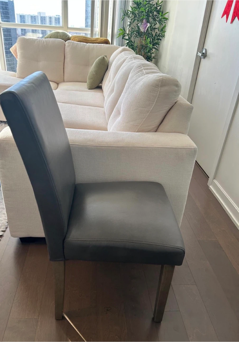 Selling a dining set with table and 4 grey leather chairs. It's in great shape and would look great in any dining room!