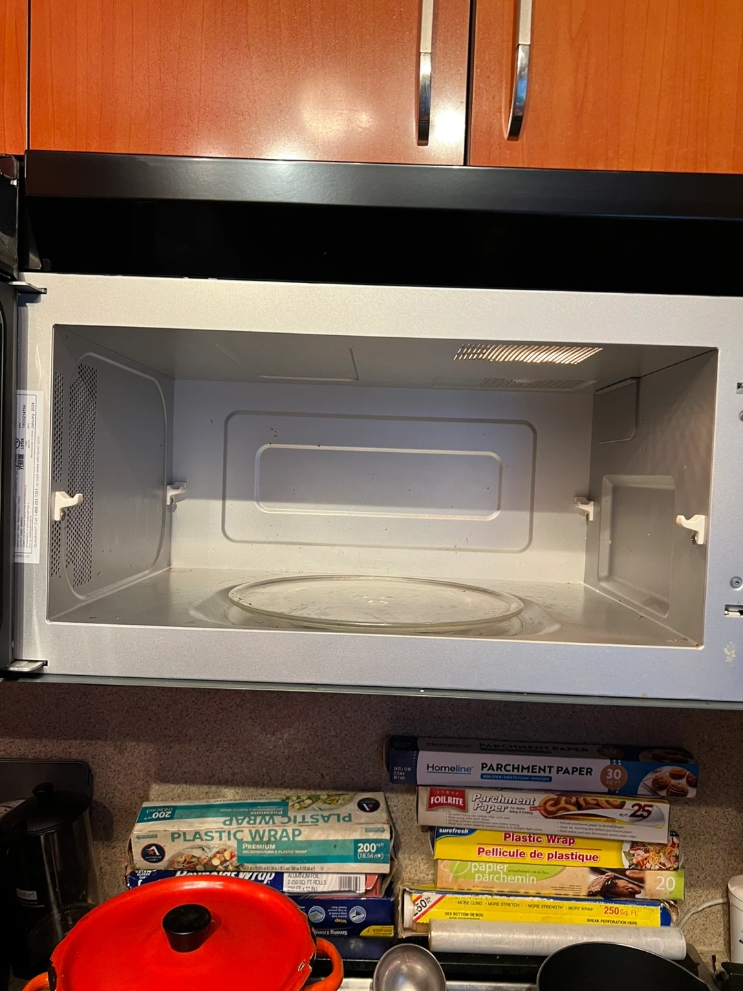 The microwave must be detached and taken out of the kitchen cabinet - by buyer