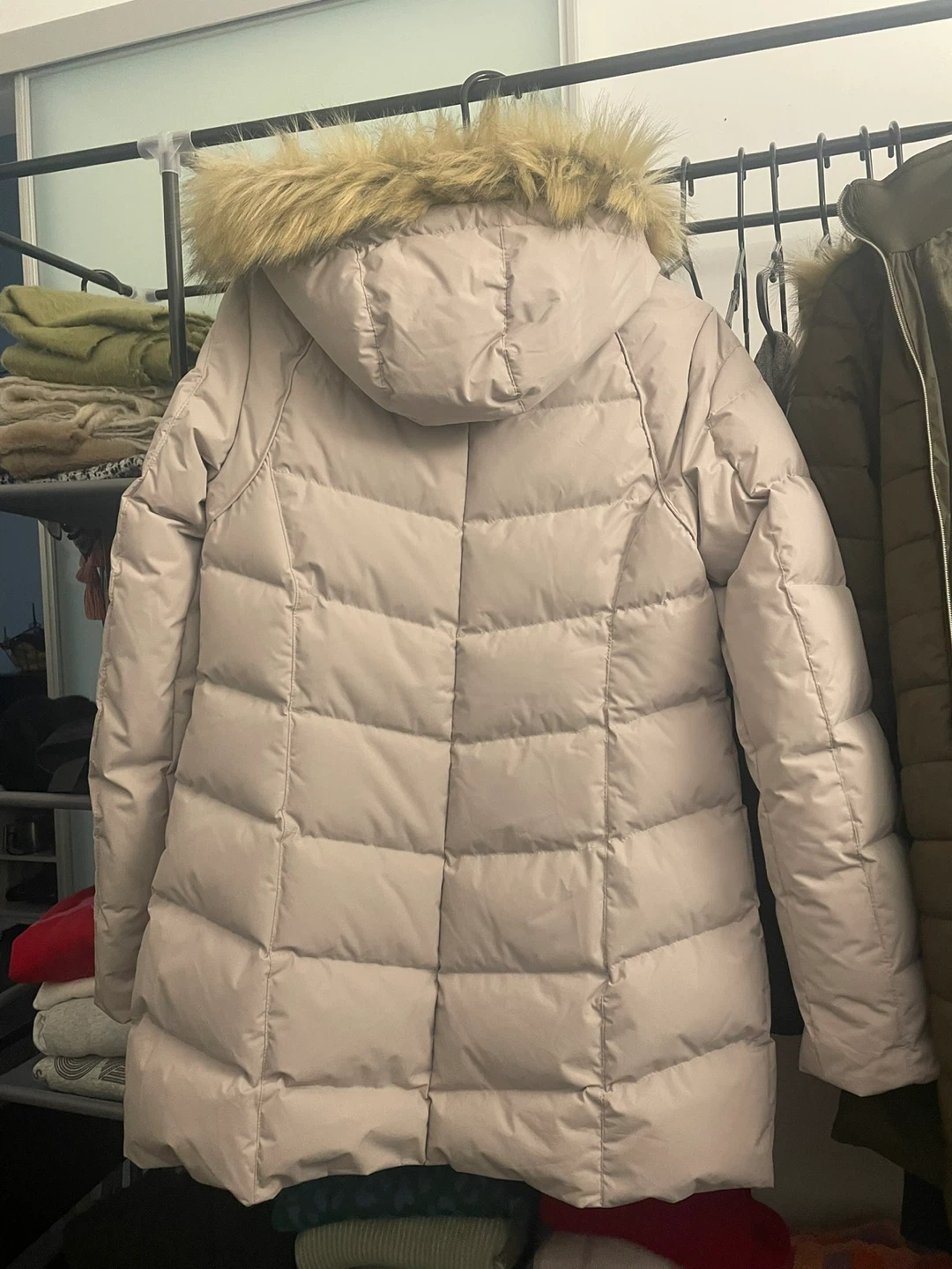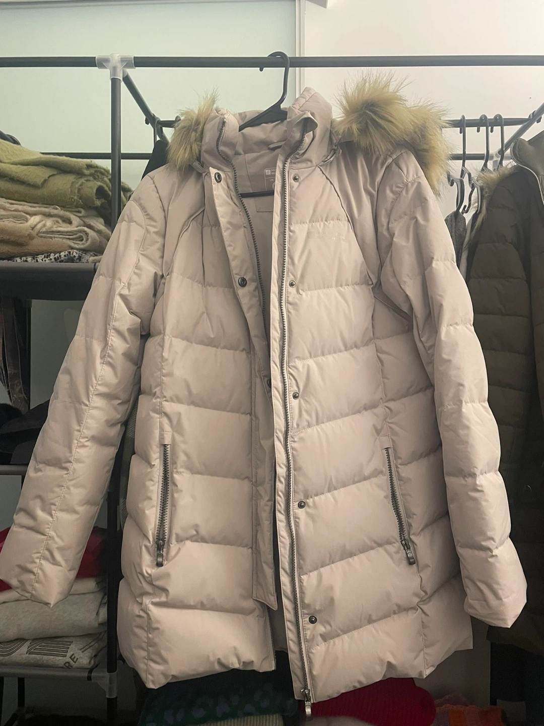 Winter puffer jacket with front pockets, very warm, and with removable hoodie. Made with feathers and fur filling. Size: S/M