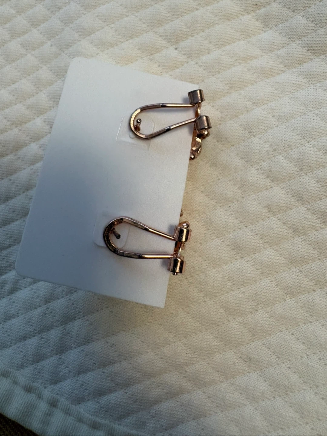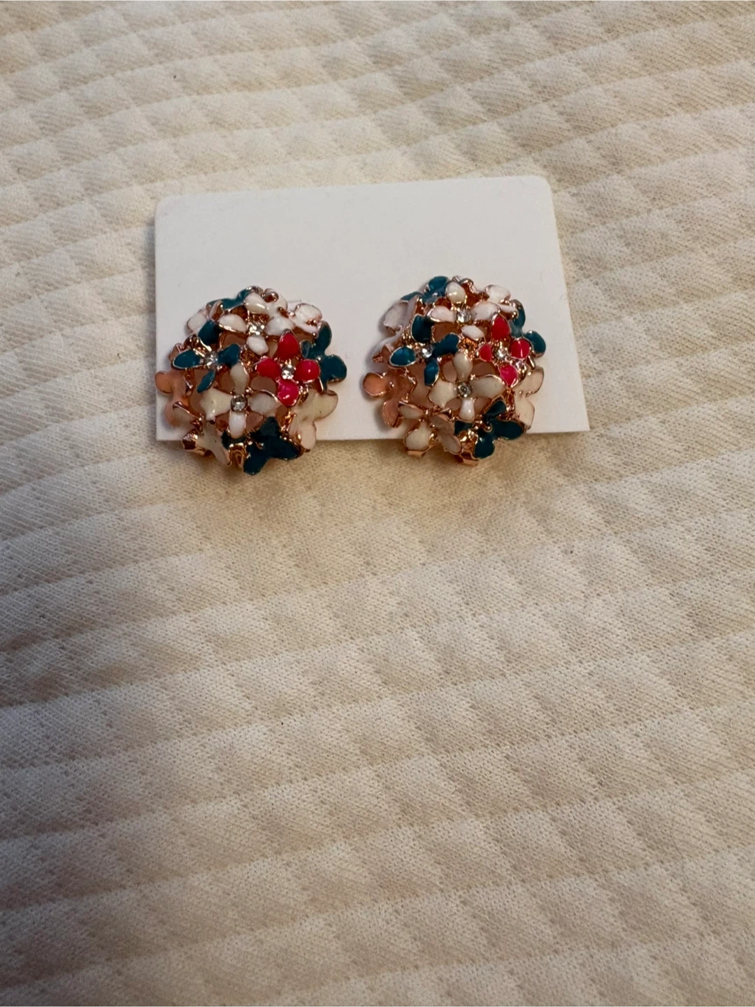 These are a pair of floral stud earrings. They feature a rose gold tone with accents of teal, red, and white. They're perfect for adding a touch of elegance to any outfit!