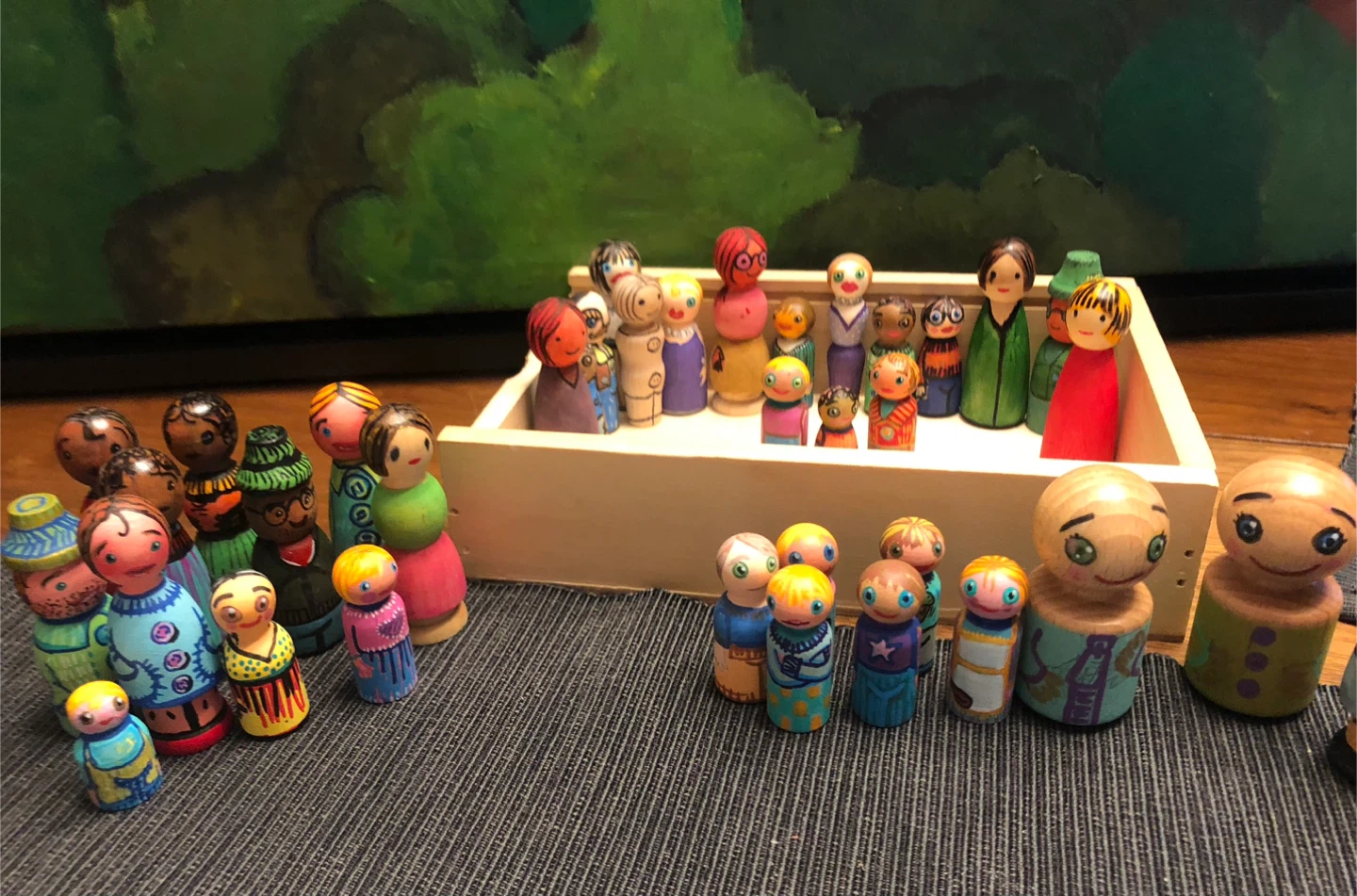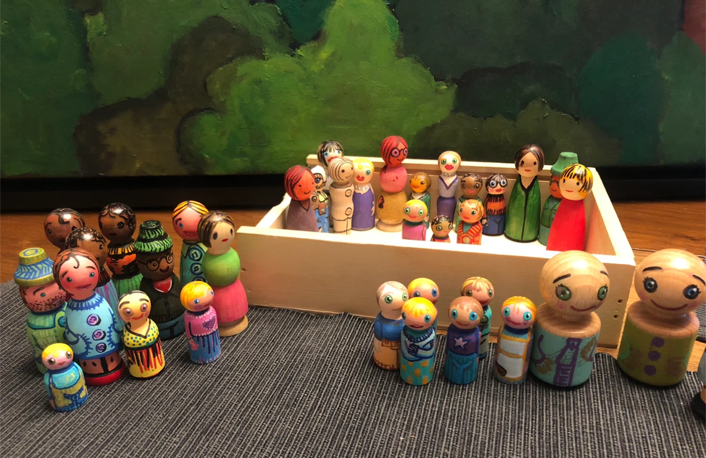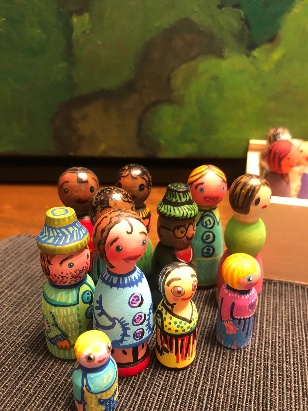 I'm selling a collection of hand-painted wooden peg dolls. Each doll is unique with its own design and colours. They would be a great addition to any collection or a fun toy for imaginative play!