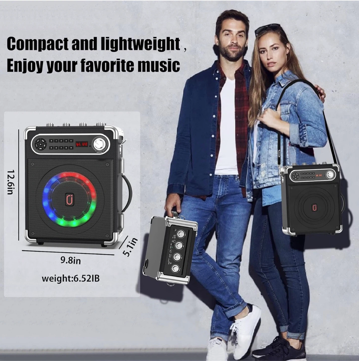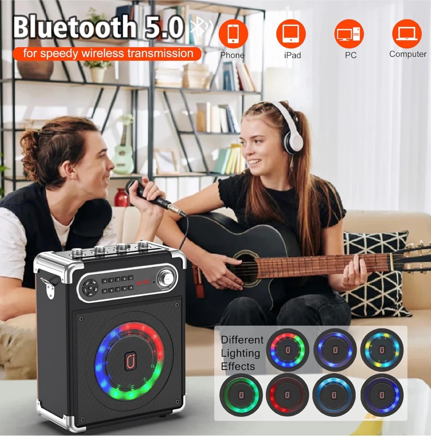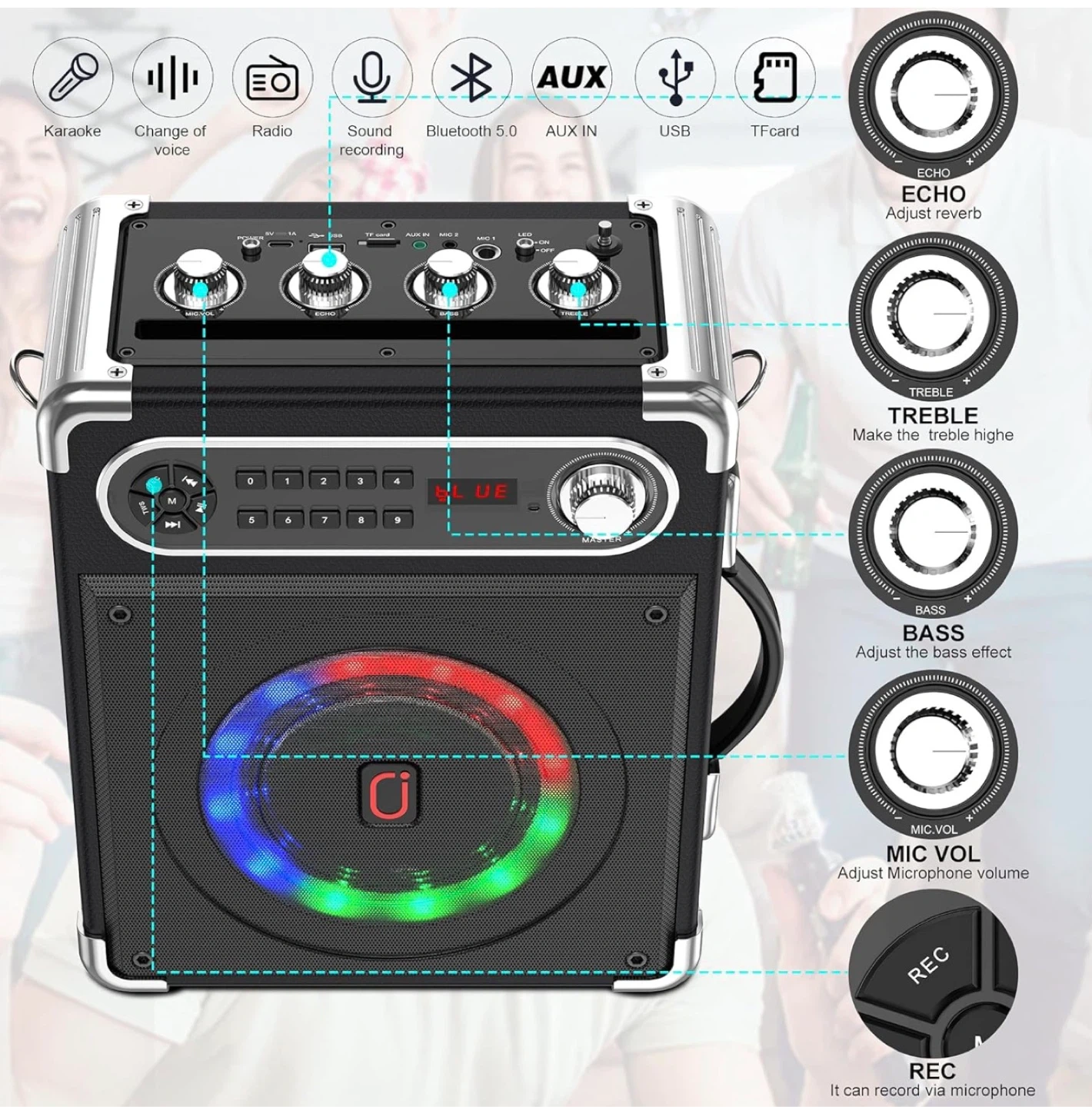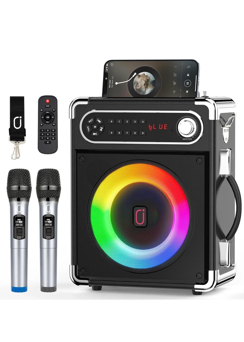 JYX Karaoke Machine with Two Wireless Microphones, Portable Bluetooth Speaker with Bass/Treble Adjustment, Remote Control and LED Lights, Supports TF Card/USB, AUX in, FM, REC for Party