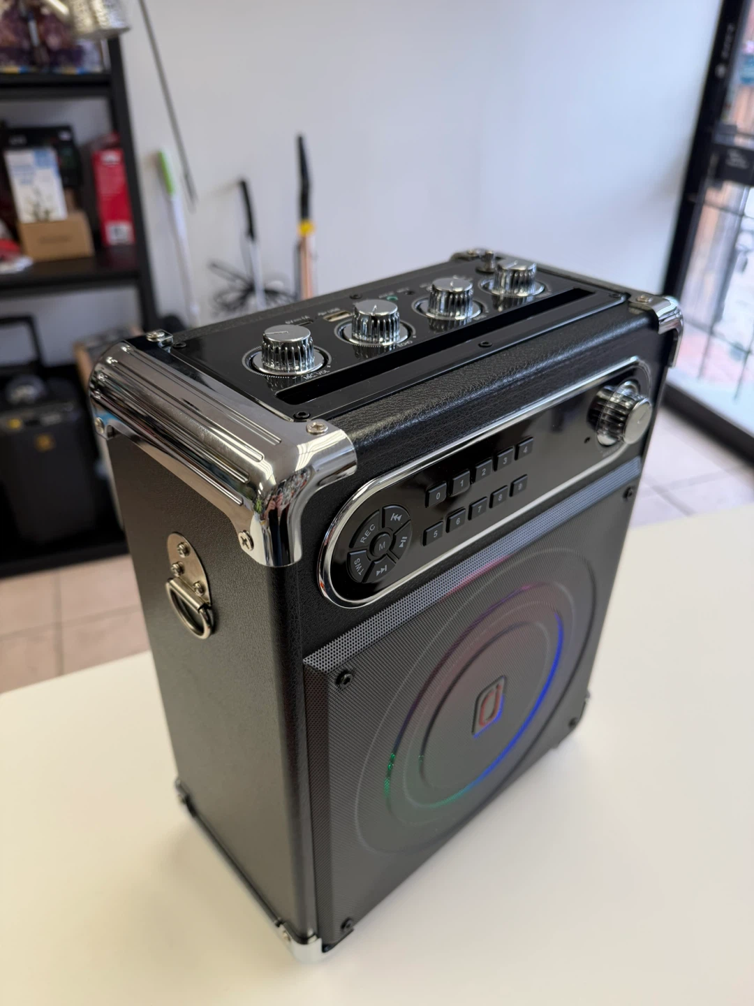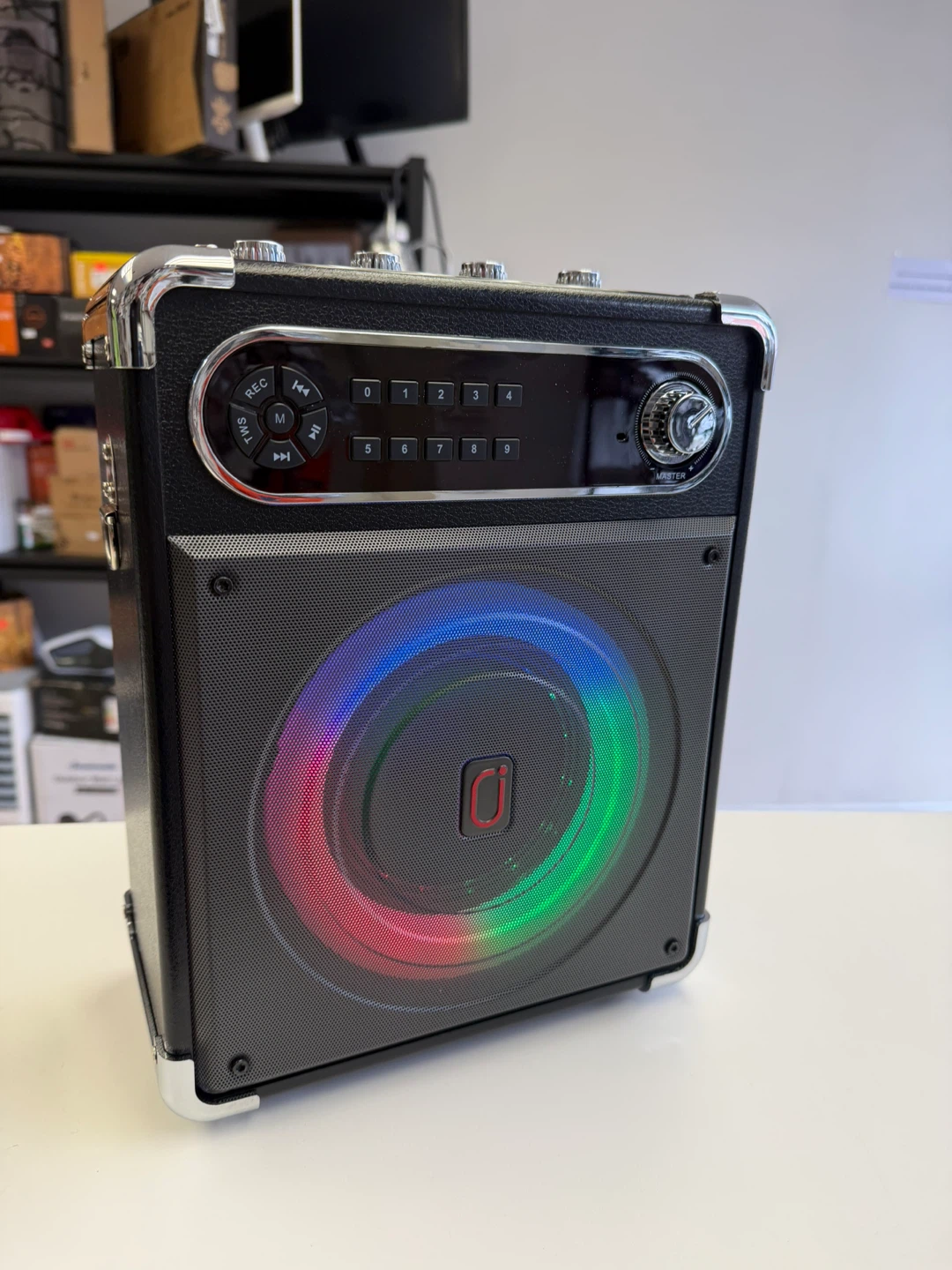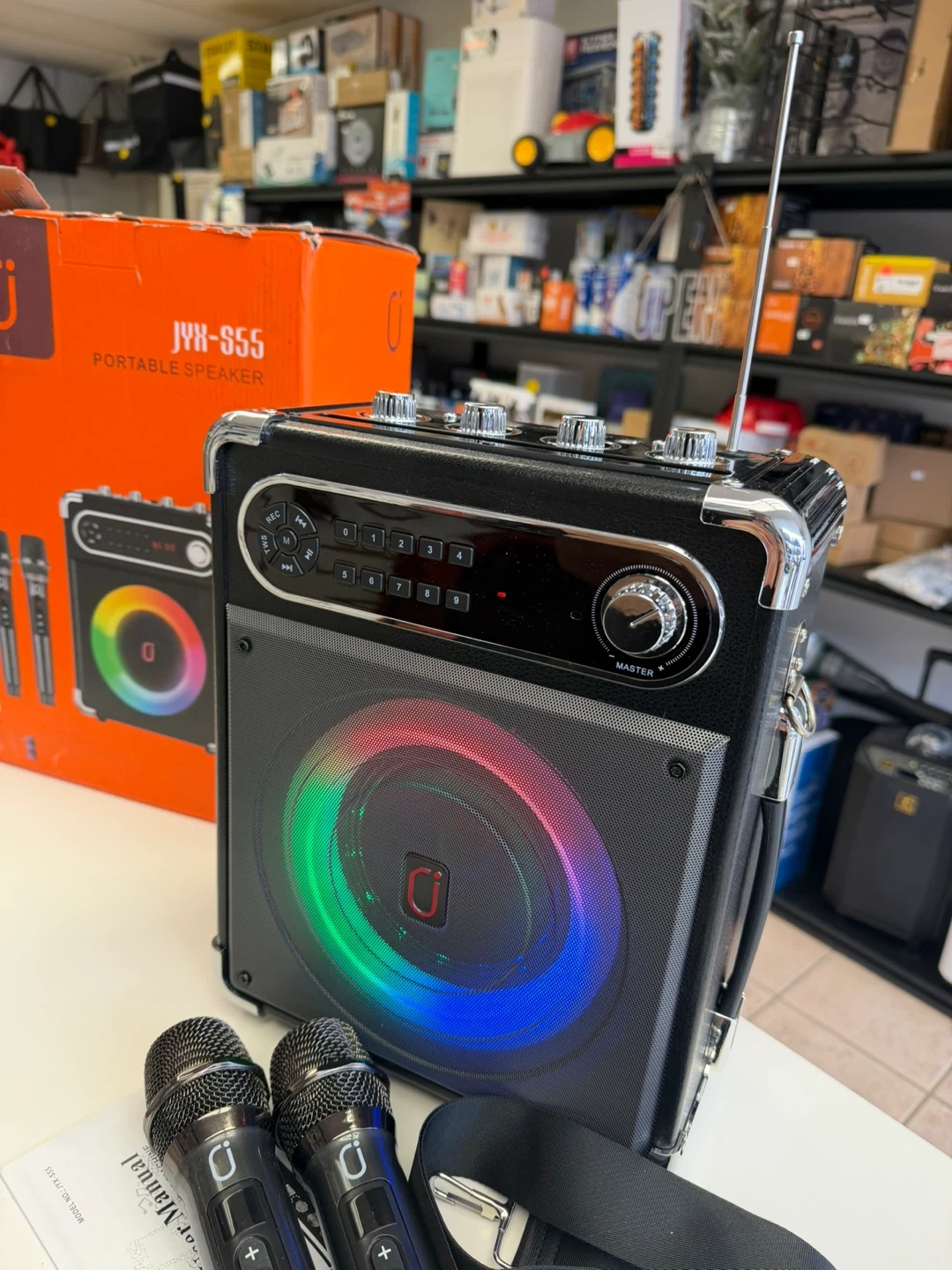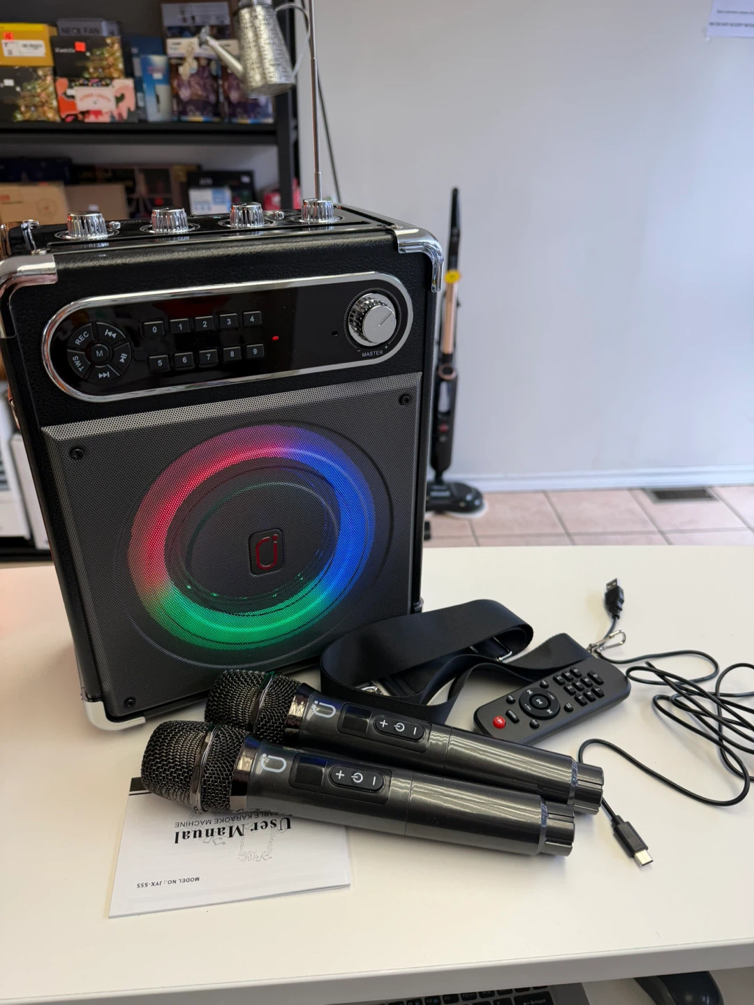 JYX Karaoke Machine with Two Wireless Microphones, Portable Bluetooth Speaker with Bass/Treble Adjustment, Remote Control and LED Lights, Supports TF Card/USB, AUX in, FM, REC for Party