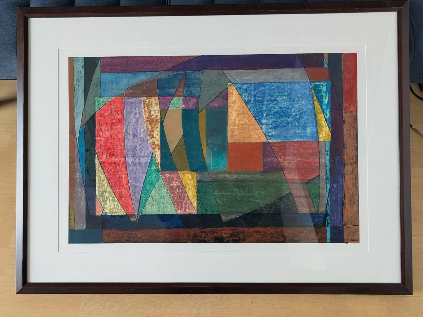 This striking abstract composition reflects the late-20th-century revival of geometric abstraction influenced by early modernist traditions. Layered planes of color—teal, ultramarine, ochre, rust, and violet—interlock in a carefully balanced structure that recalls the legacy of Synthetic Cubism and the poetic geometry of Paul Klee. Curvilinear forms intersect with rectilinear blocks, creating a rhythmic spatial tension that suggests both architectural order and organic movement.