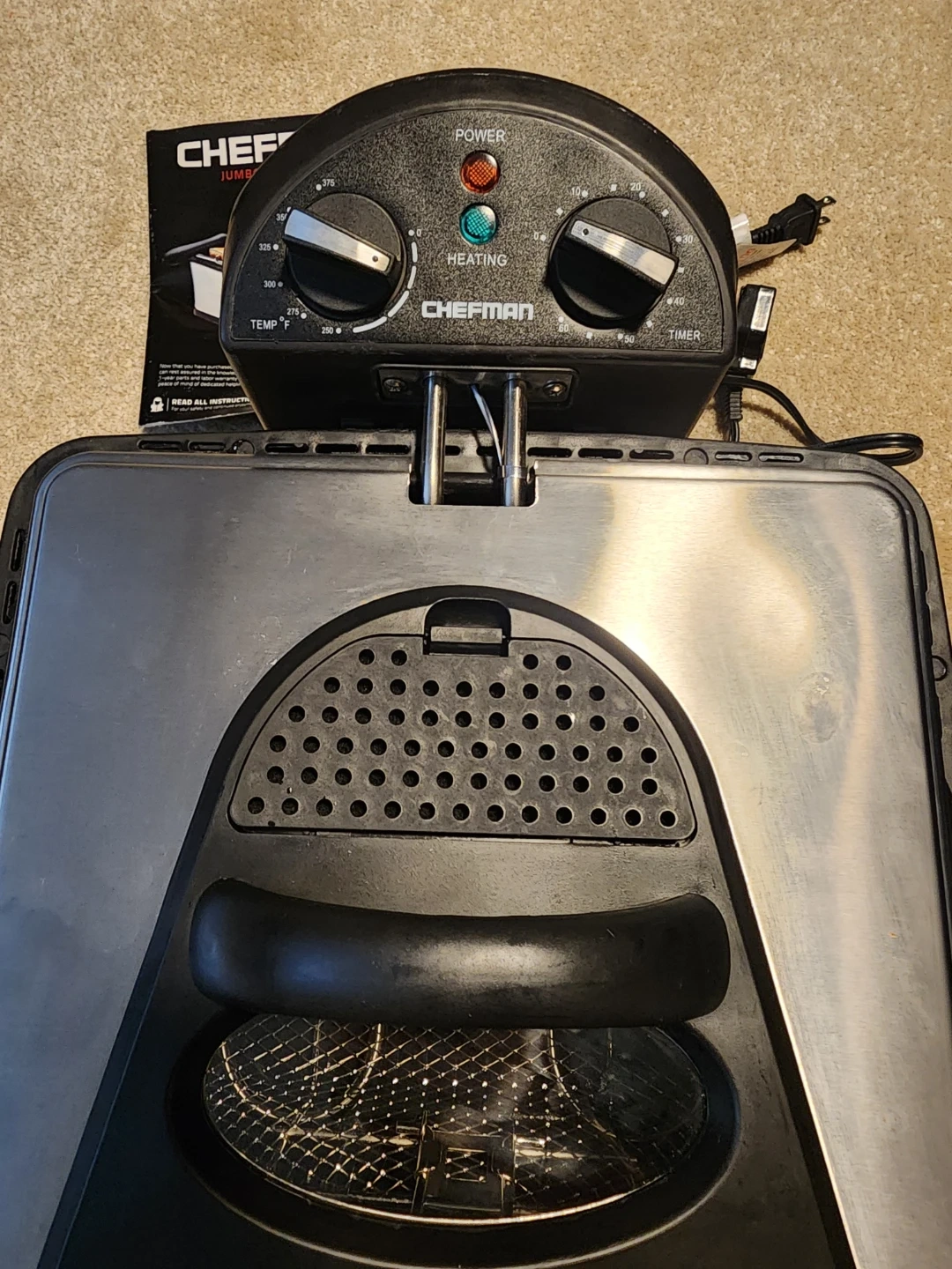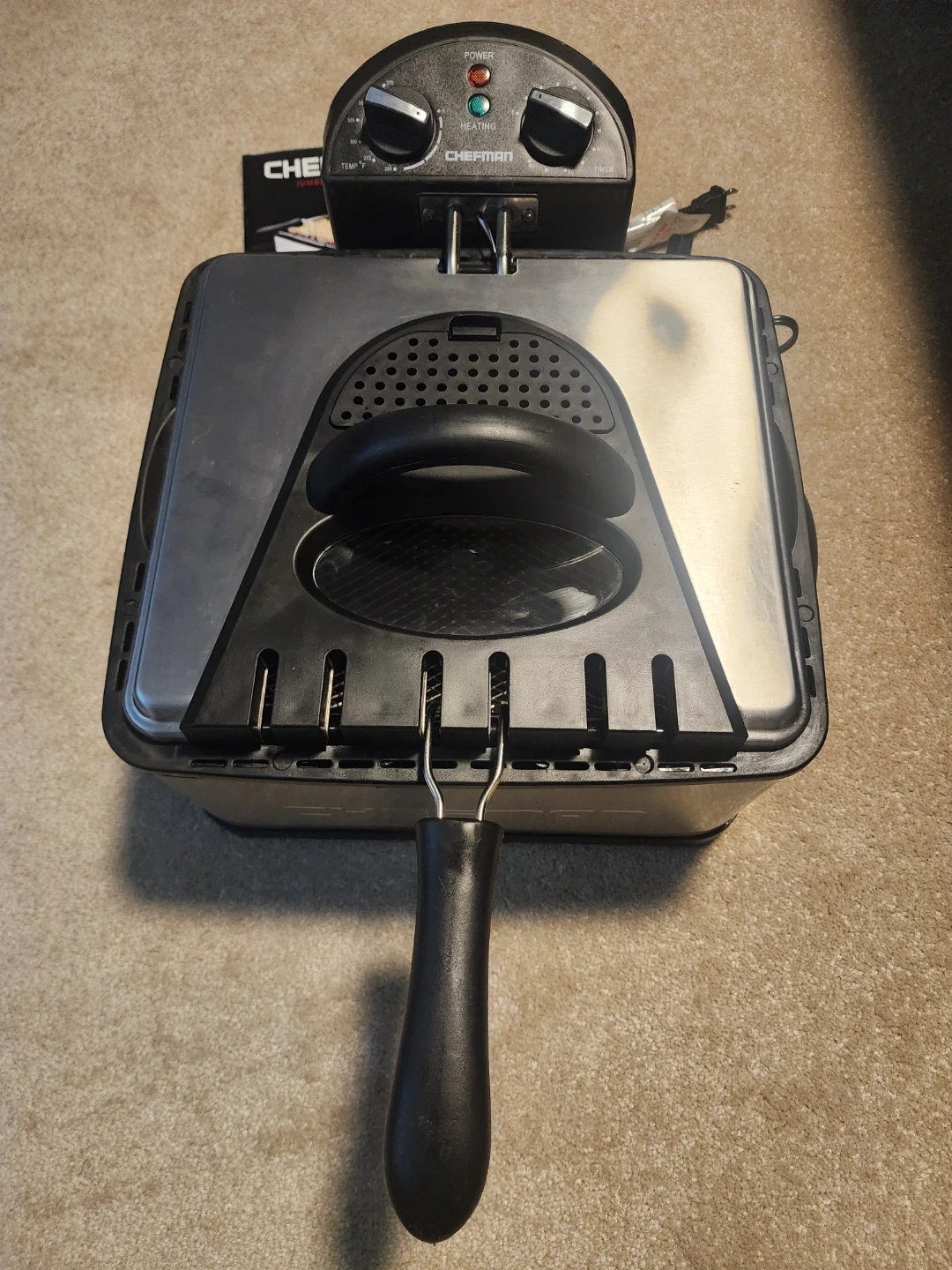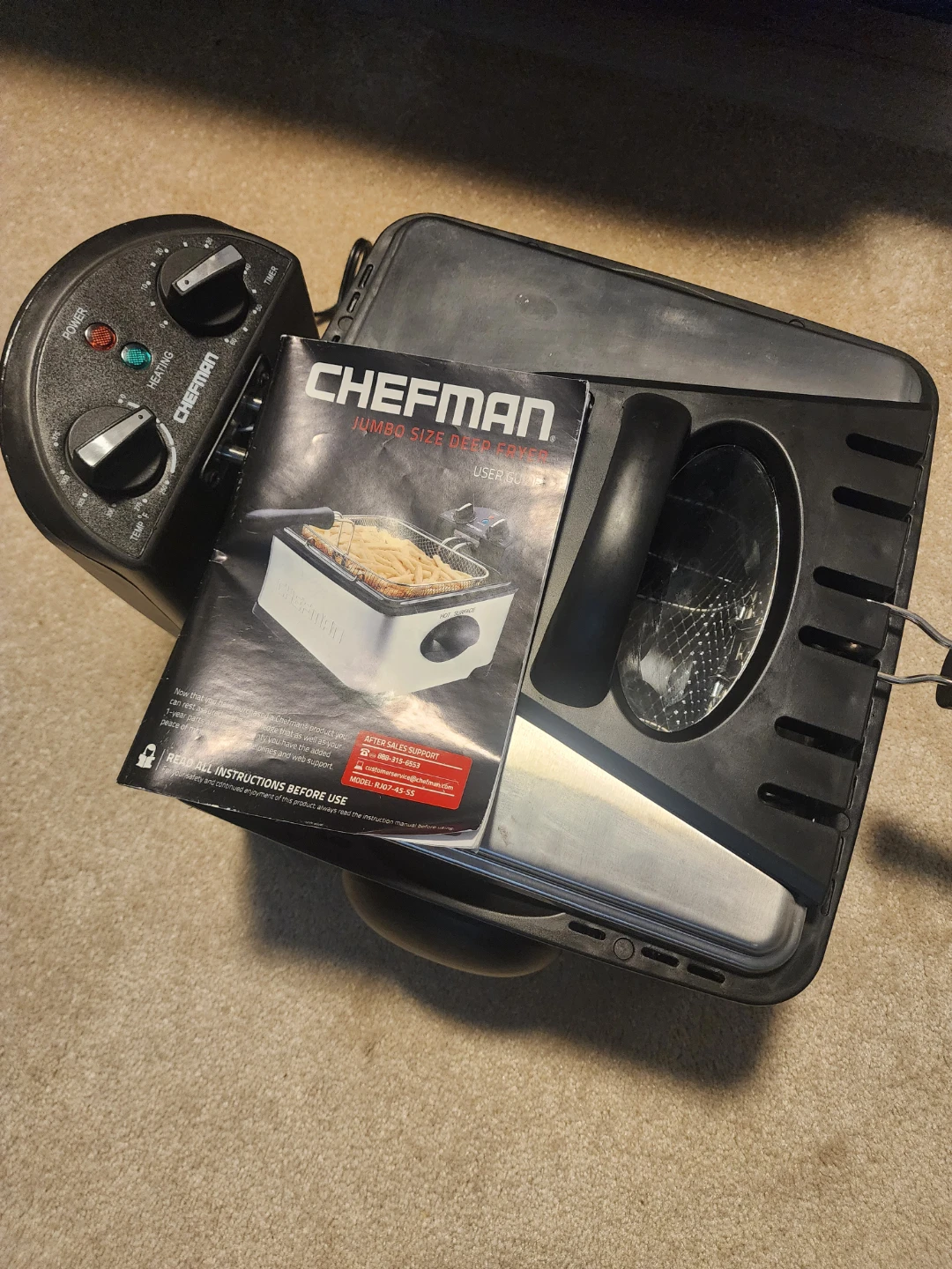 Chefman Jumbo Size Deep Fryer. Brand new, you will see from the filters that it has never been used. Includes removable dishwasher-safe bowl, basket, handle, and user guide. The fryer has a viewing window and permanent aluminum filter. Price is firm, no lowballing please.