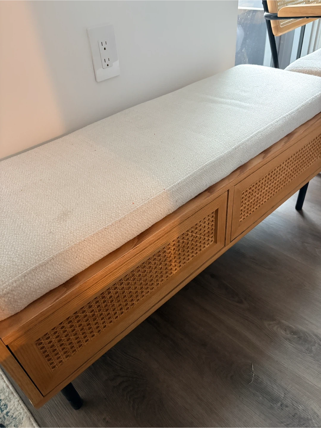 Selling a stylish rattan bench! It features a lovely cream-coloured cushion on top. The bench has a natural wood finish and would look great in an entryway or living room. It's in great condition and ready for a new home!