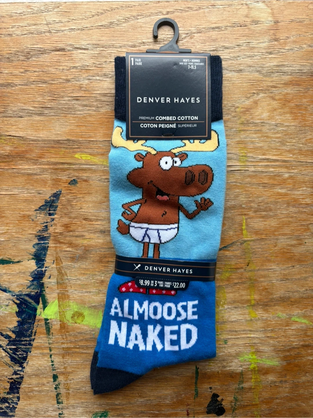 Selling a pair of Denver Hayes socks, featuring a fun 'Almoose Naked' design! These are men's size 7-11.5 and made of premium combed cotton for extra comfort