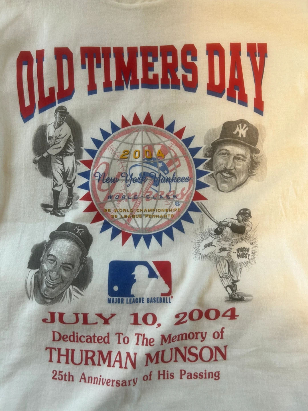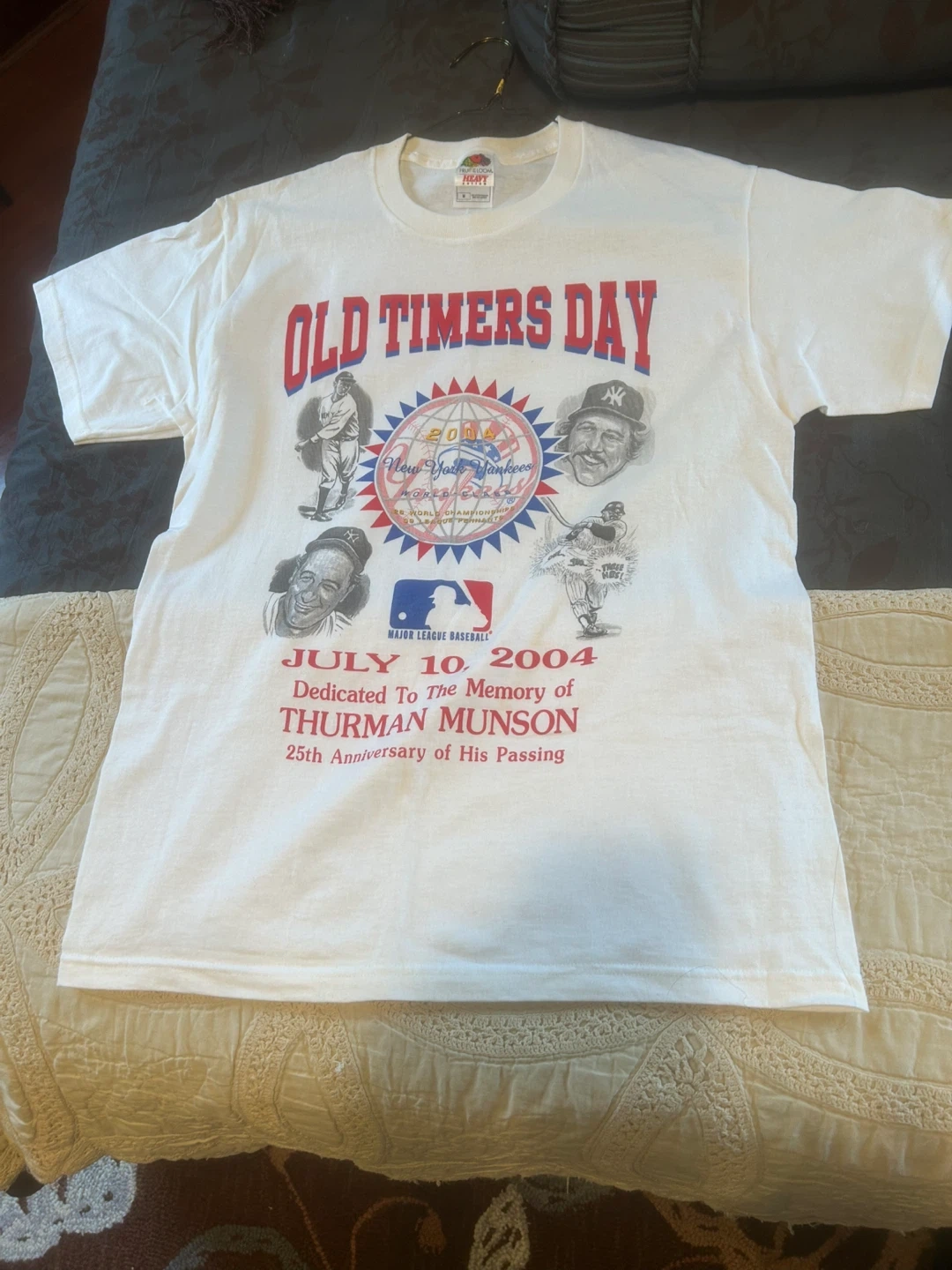 Selling a Fruit of the Loom t-shirt featuring the New York Yankees Old Timers Day from July 10, 2004. The shirt commemorates Thurman Munson's 25th anniversary of his passing. It's a size medium and made of heavy cotton. Pristine, never worn.