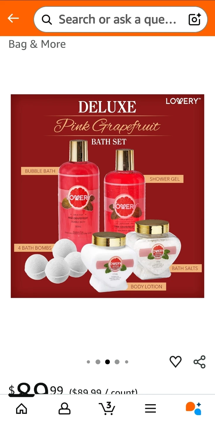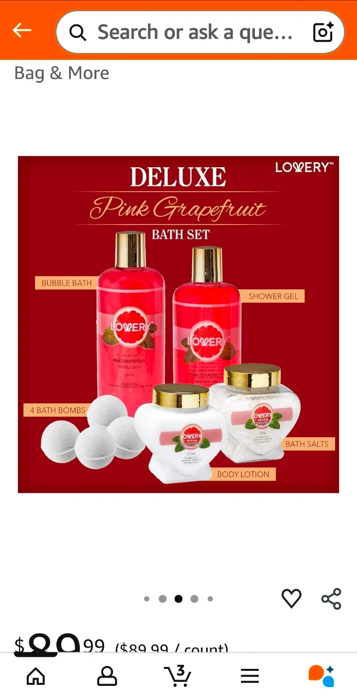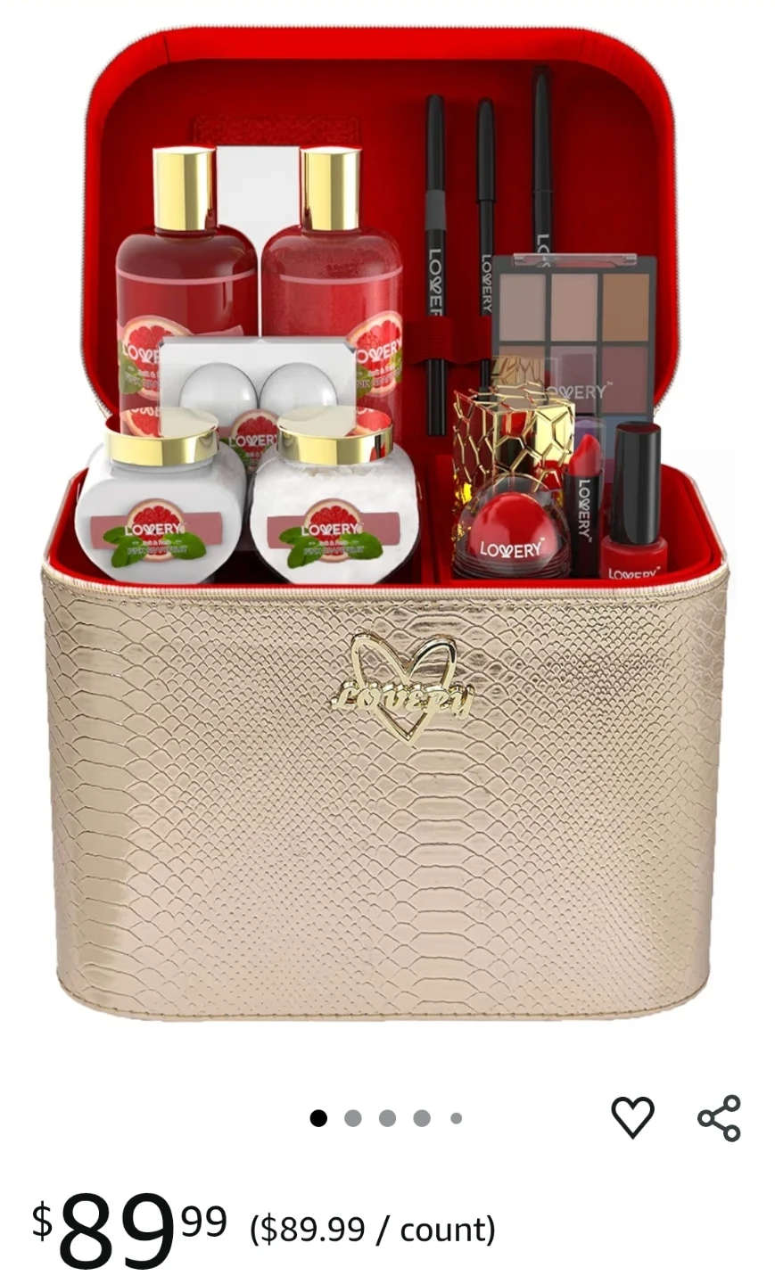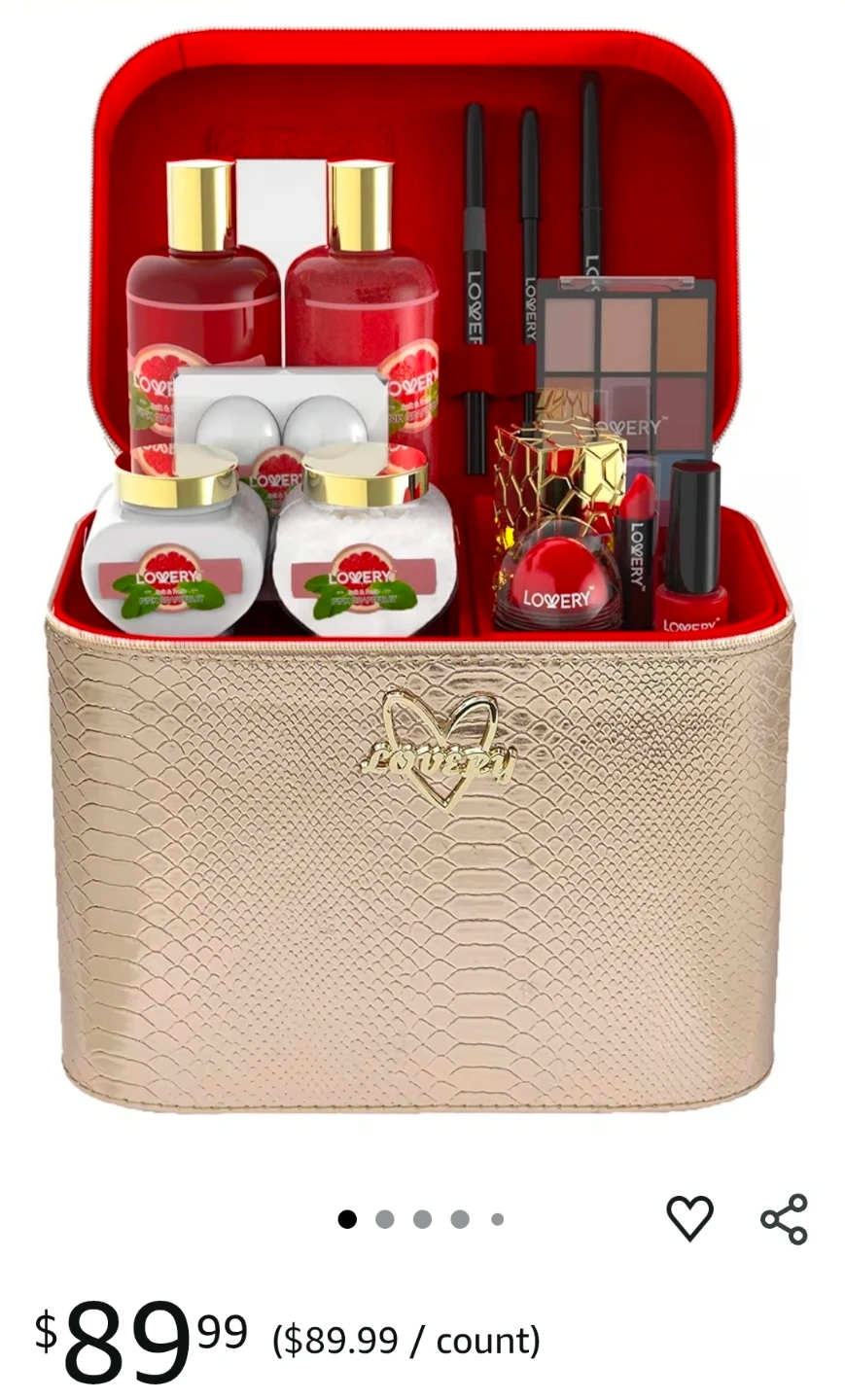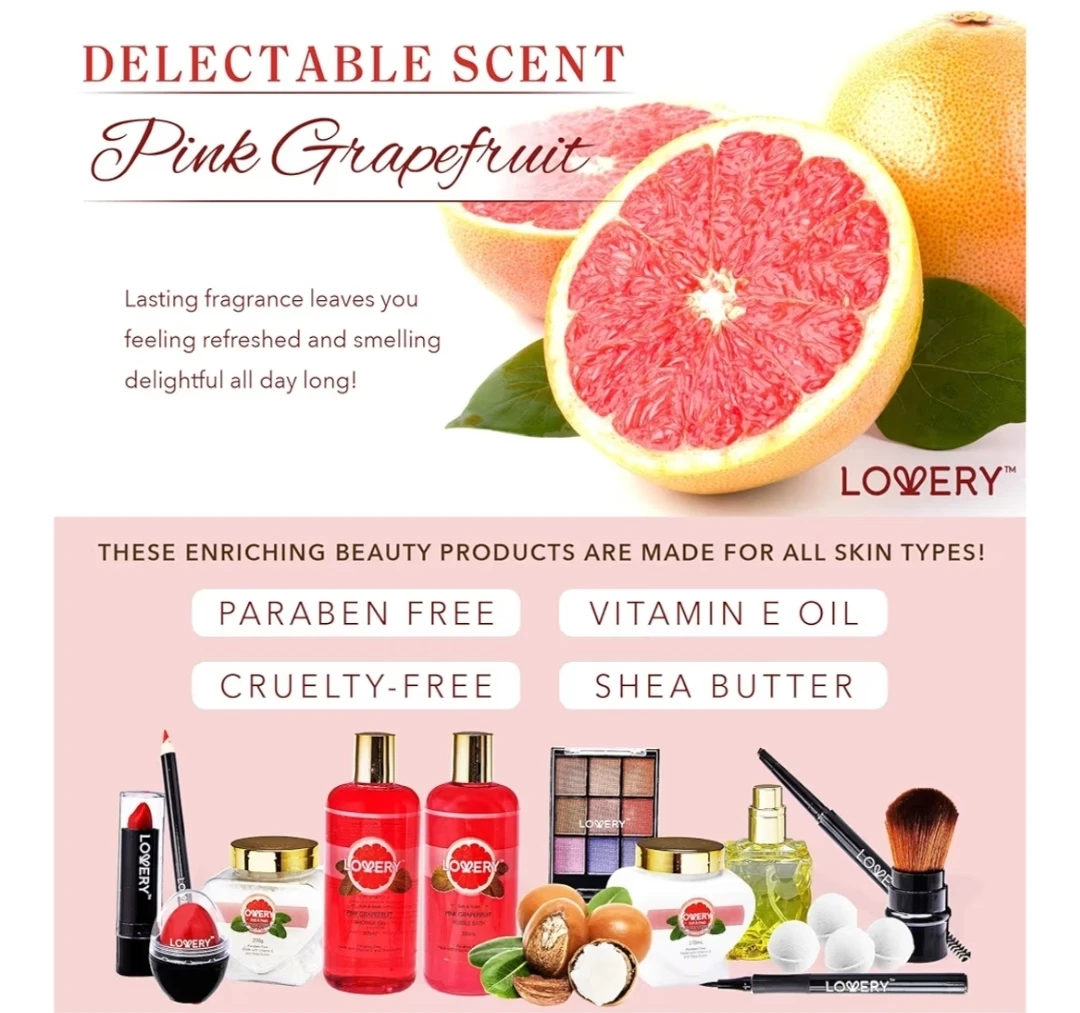 This LOVERY Deluxe Pink Grapefruit set includes both makeup and bath items. The set features a delectable scent and enriching beauty products made for all skin types! It's paraben-free, cruelty-free, and contains vitamin E oil and shea butter. Originally bought for $89.99