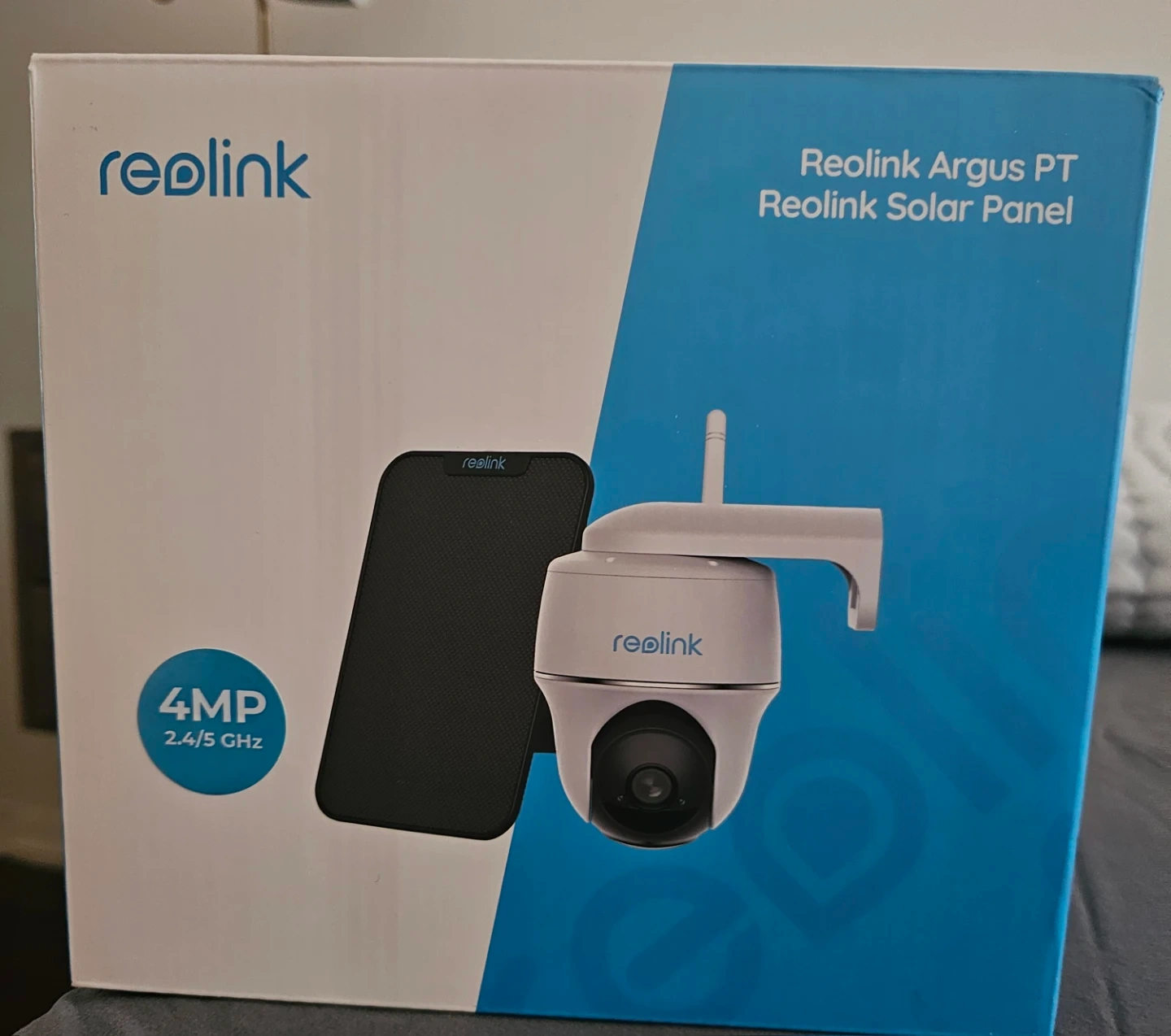 New Reolink Argus PT camera with a Reolink Solar Panel. It's still in the box and has never been used. The camera is 4MP and supports 2.4/5 GHz Wi-Fi.