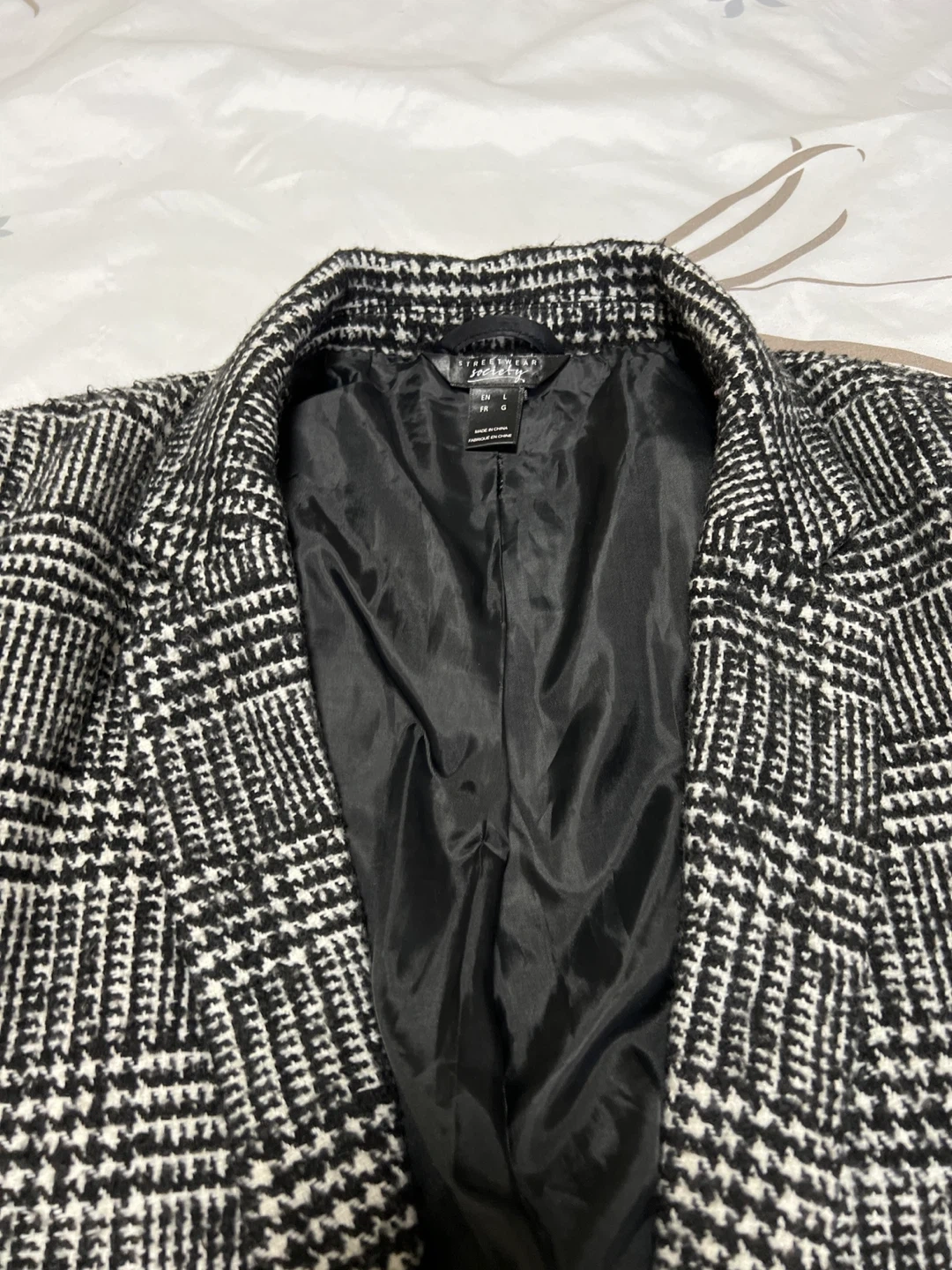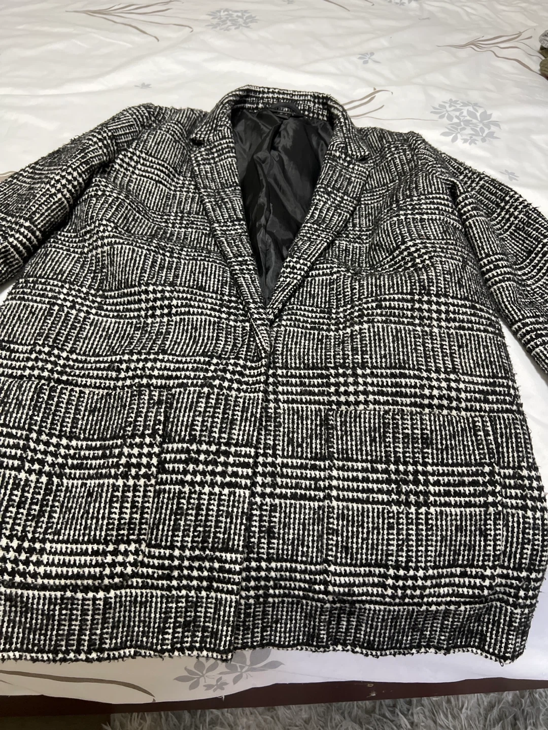 streetwear blazer in a classic black and white plaid pattern. It's a size largeand in great condition. Perfect for adding a touch of sophistication to any outfit!