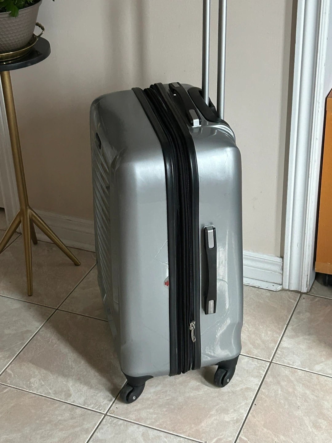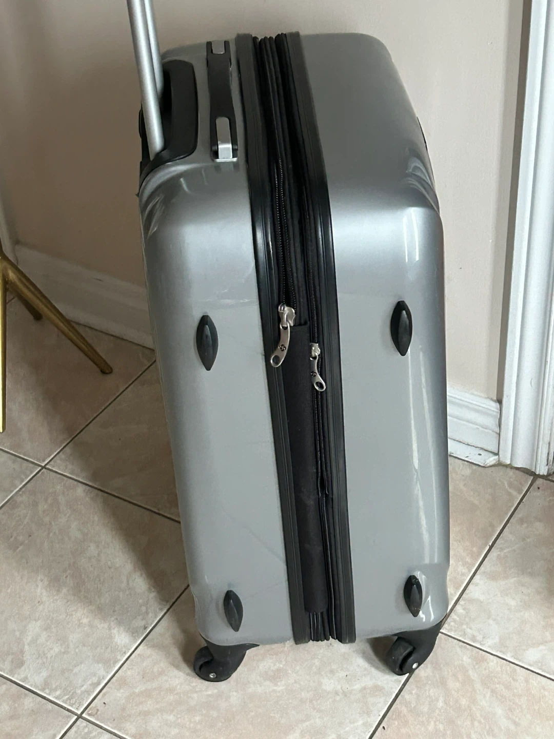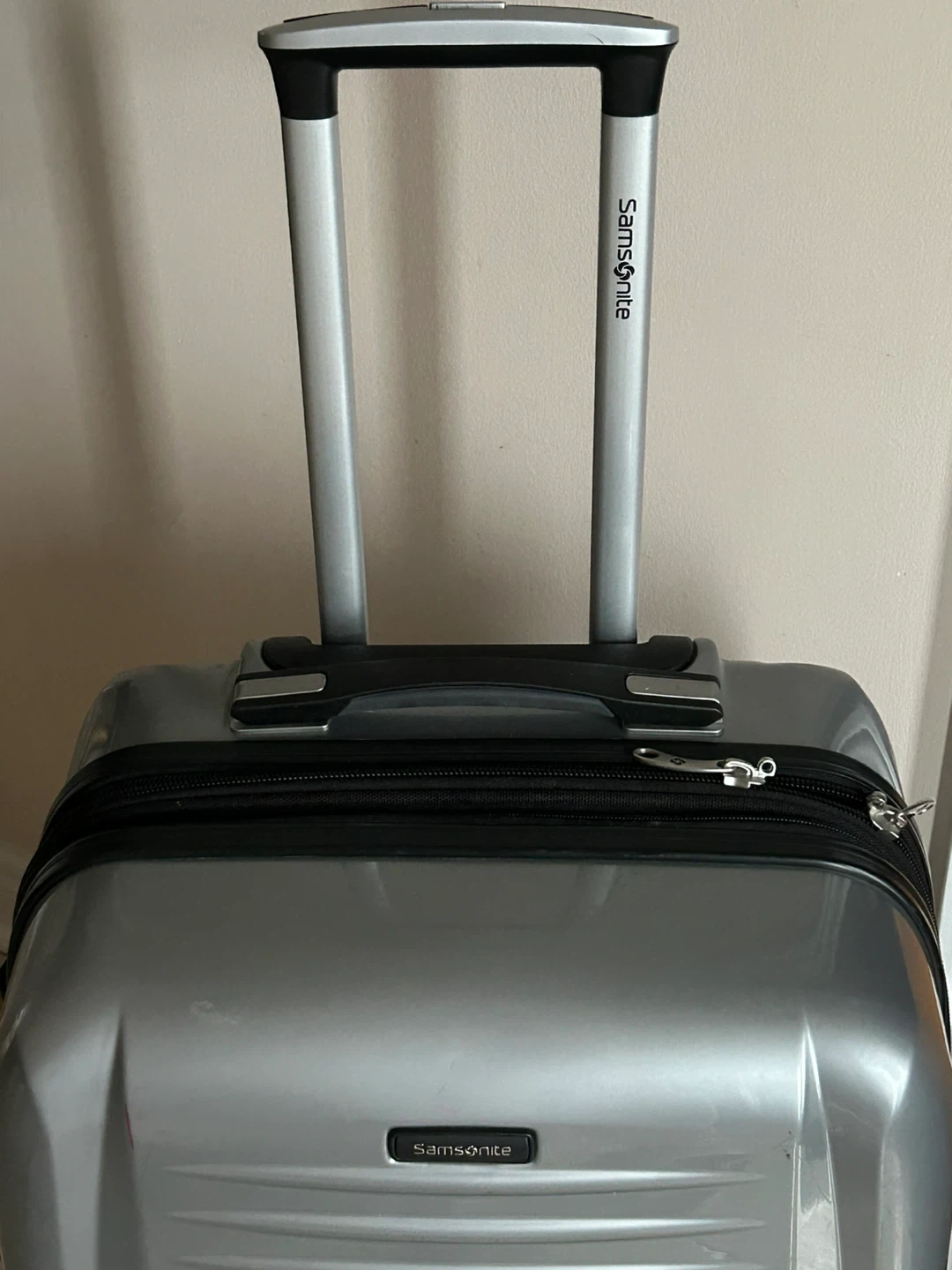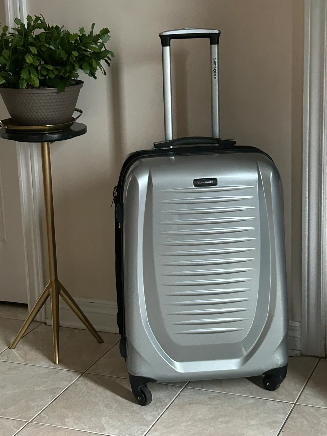 Selling a Samsonite spinner check in suitcase in silver. It has some scratches from use, but is still in good working condition. Perfect for your next trip!