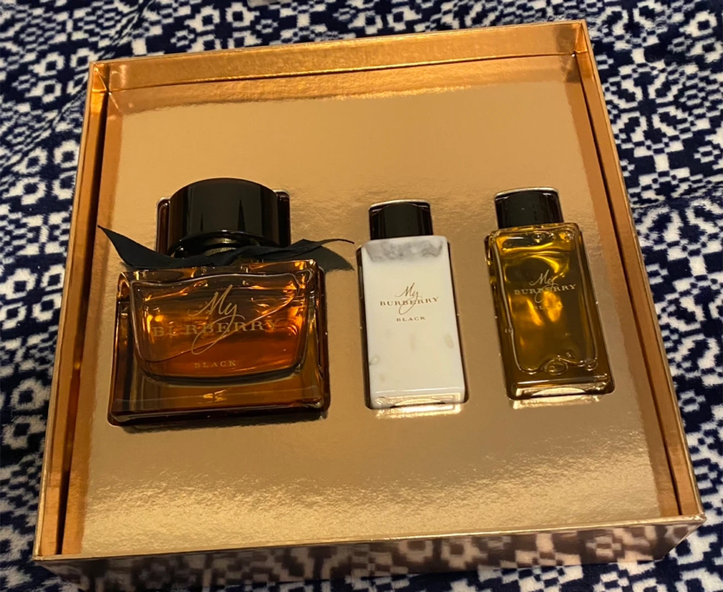 Selling a Burberry My Burberry Black gift set. It includes the perfume and two smaller bottles, all in the original box. The box is in great condition and would make a lovely gift for someone!