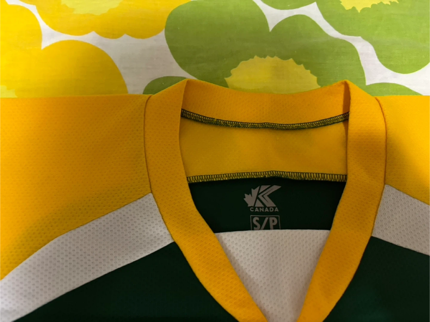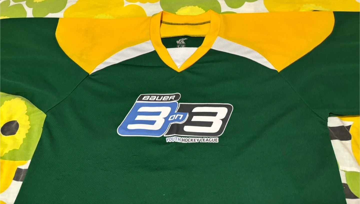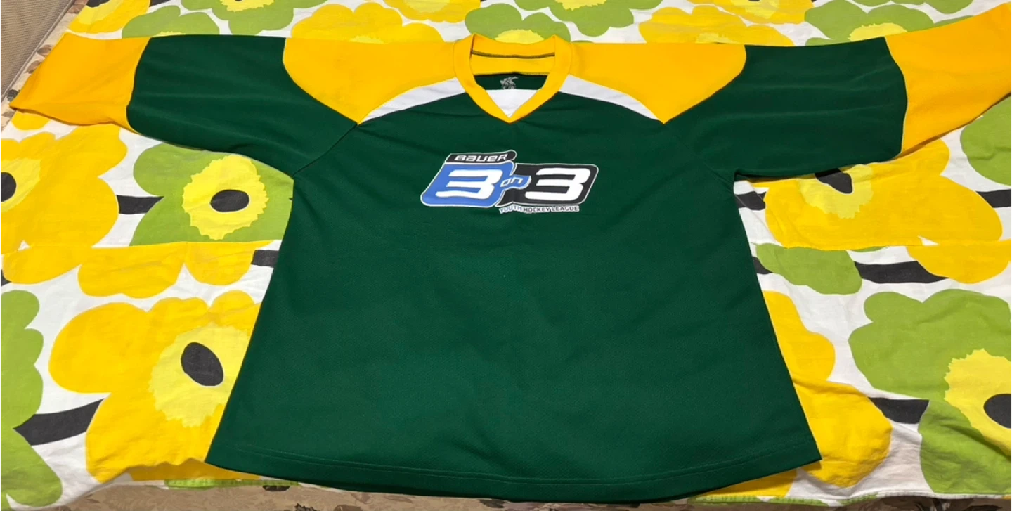 One is a Bauer 3 on 3 Youth Hockey League jersey in green and yellow, size S/P.
