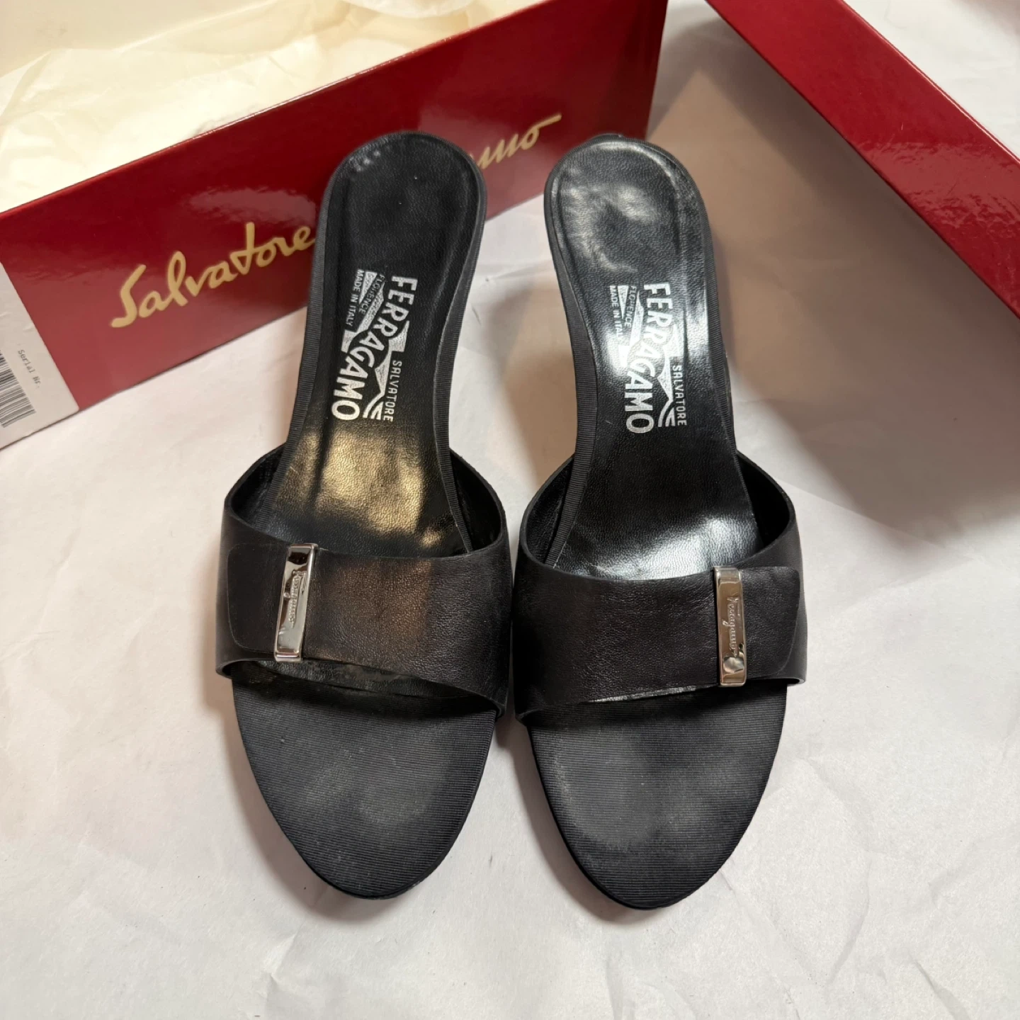 Selling a pair of Salvatore Ferragamo heeled sandals in black leather.