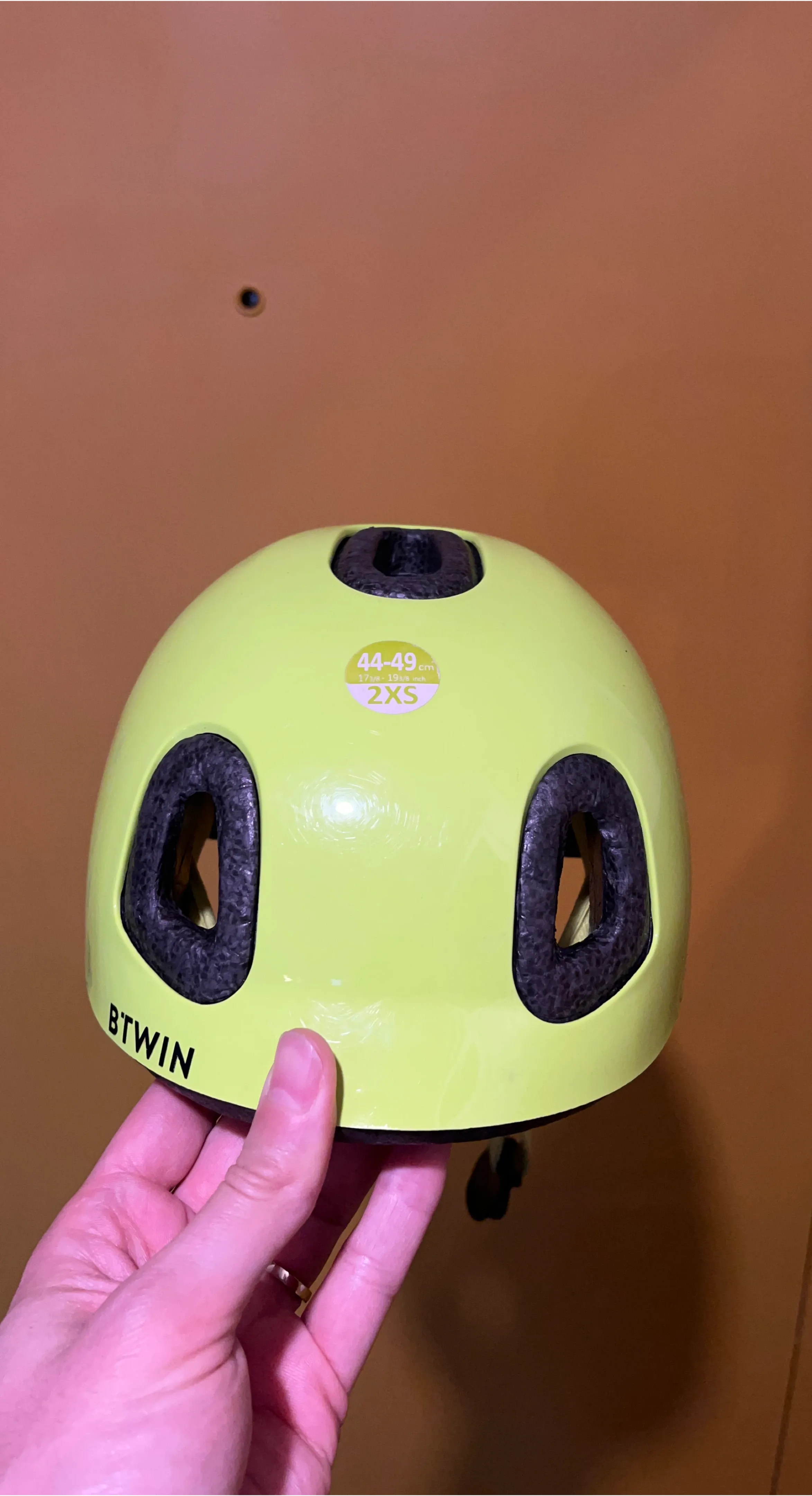 Selling a BTWIN kids bike helmet in size 2XS. The helmet is yellow and suitable for head sizes 44-49 cm. It's in great condition and ready for your little one's cycling adventures