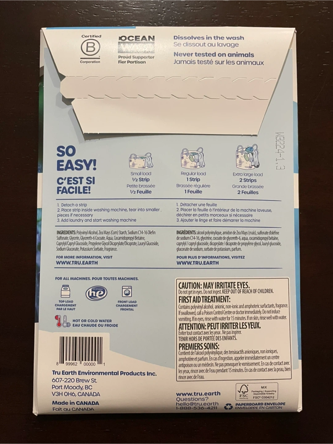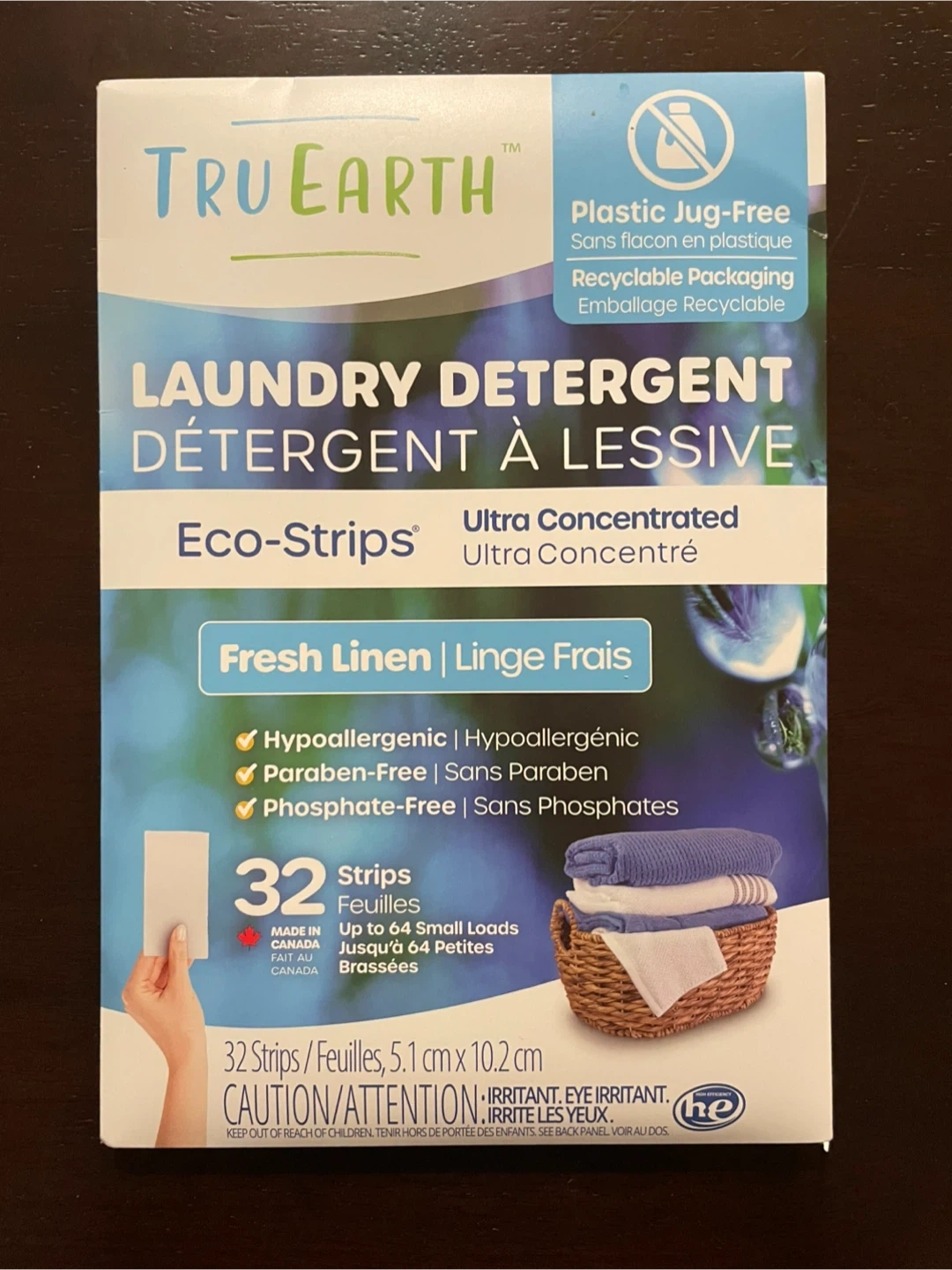I'm selling a box of Tru Earth laundry detergent eco-strips in the fresh linen scent. These strips are hypoallergenic, paraben-free, and phosphate-free. Each box contains 32 strips, good for up to 32 small loads. They're also plastic jug-free and come in recyclable packaging!