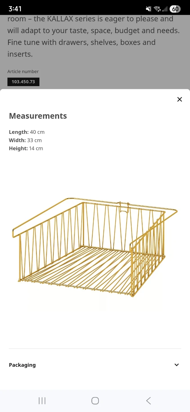 Selling a gold wire basket that fits perfectly into an IKEA Kallax shelf unit! It's in great condition and ready to add some stylish storage to your space. The dimensions are 40 cm (length) x 33 cm (width) x 14 cm (height)