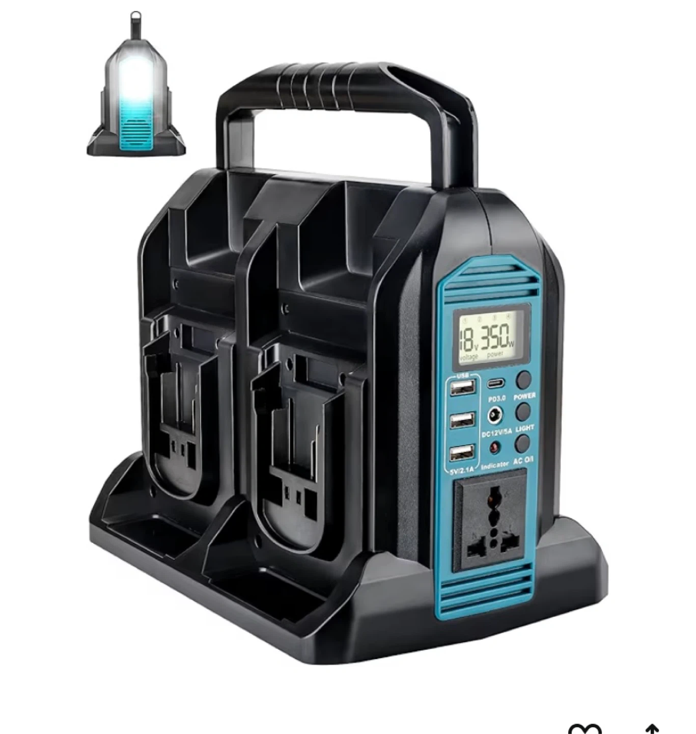 This portable power station is perfect for charging your devices on the go! It features a real-time status display and enhanced safety features. It automatically cuts power under 16V to prevent battery drain and if the load surpasses 350W. It can work with 1-4 batteries inserted.