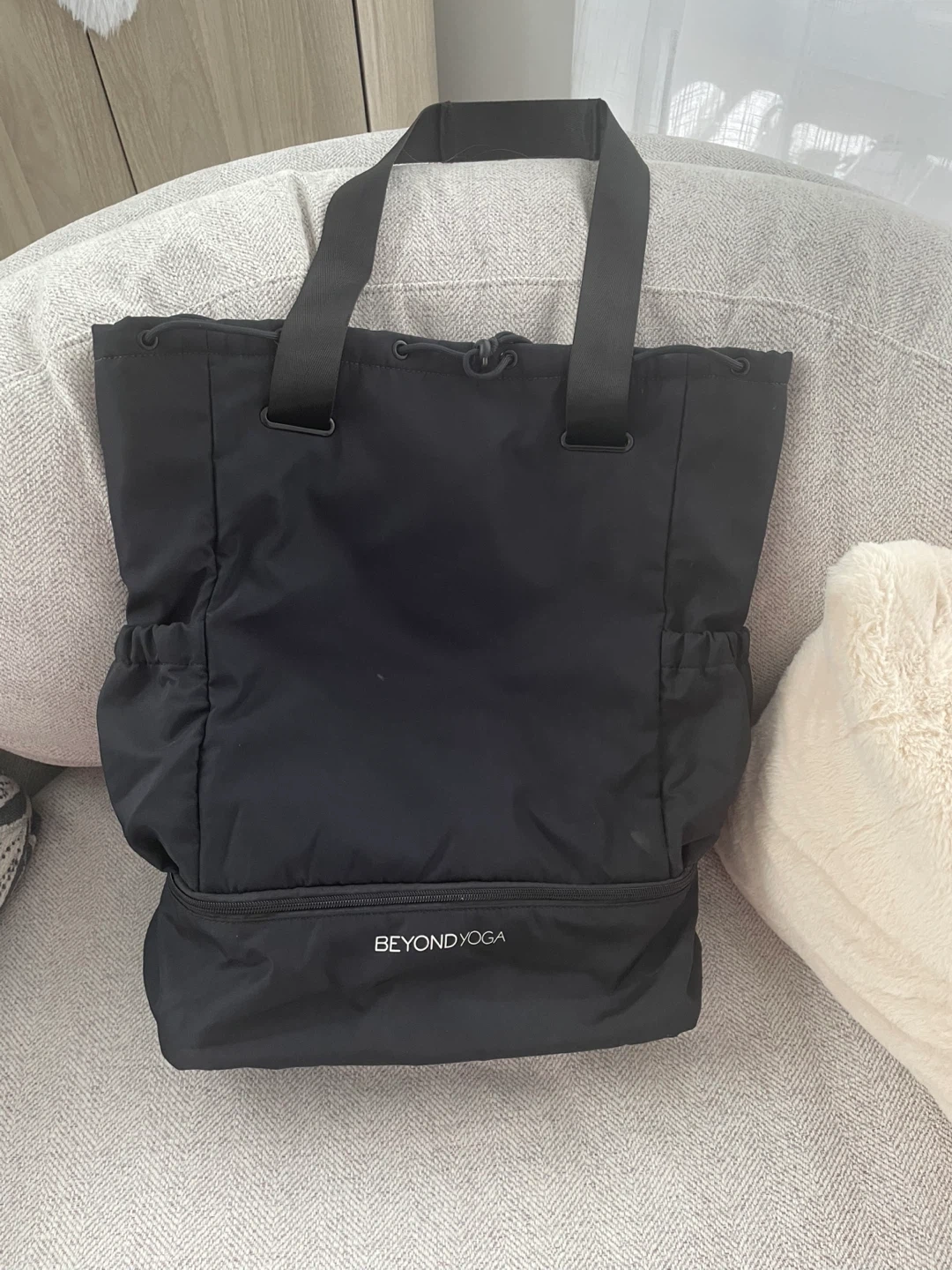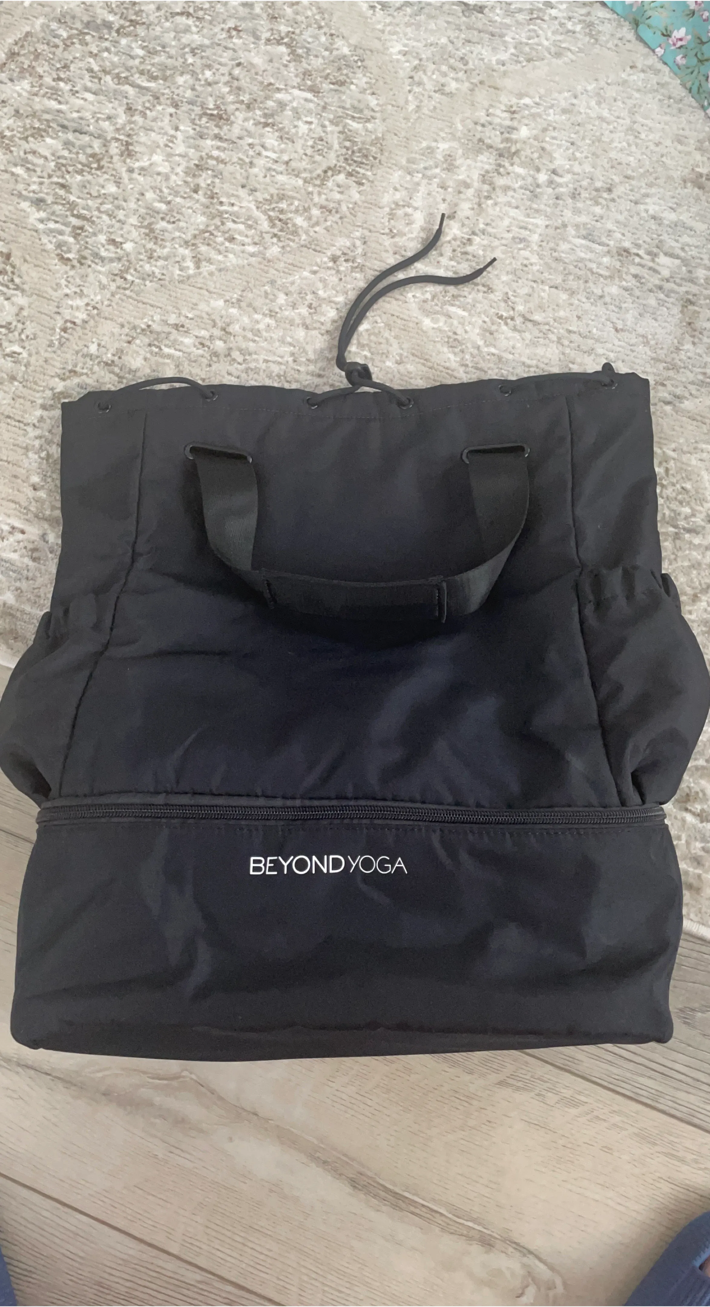I'm selling a Beyond Yoga backpack tote bag in black. It's never been used and ready for a new owner! It has a sporty design with a top handle and adjustable shoulder straps. Small zipper pocket inside, perfect for keys or phone. Two elastic pockets on the side for water bottle or other essentials. Bottom zipper pocket for separate shoe storage.