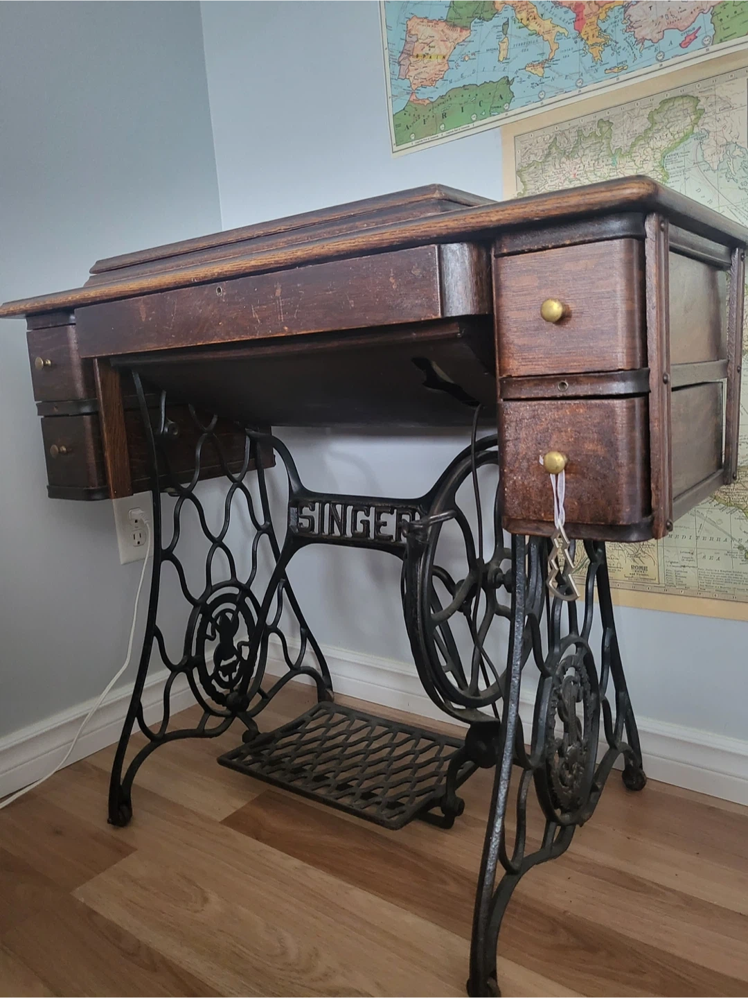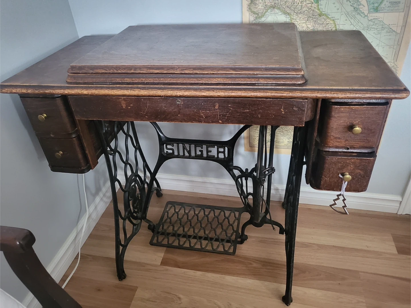Selling a vintage Singer sewing machine table. It's a beautiful piece with a dark wood finish and ornate iron legs. It has a few small drawers for storage. A charming addition to any room!