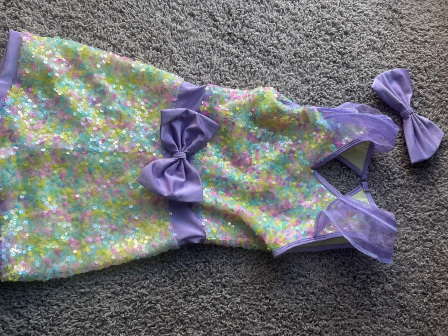 Cute sequin dress with a bow detail! It's very colourful and would be perfect for a special occasion. Comes with a matching bow for the hair