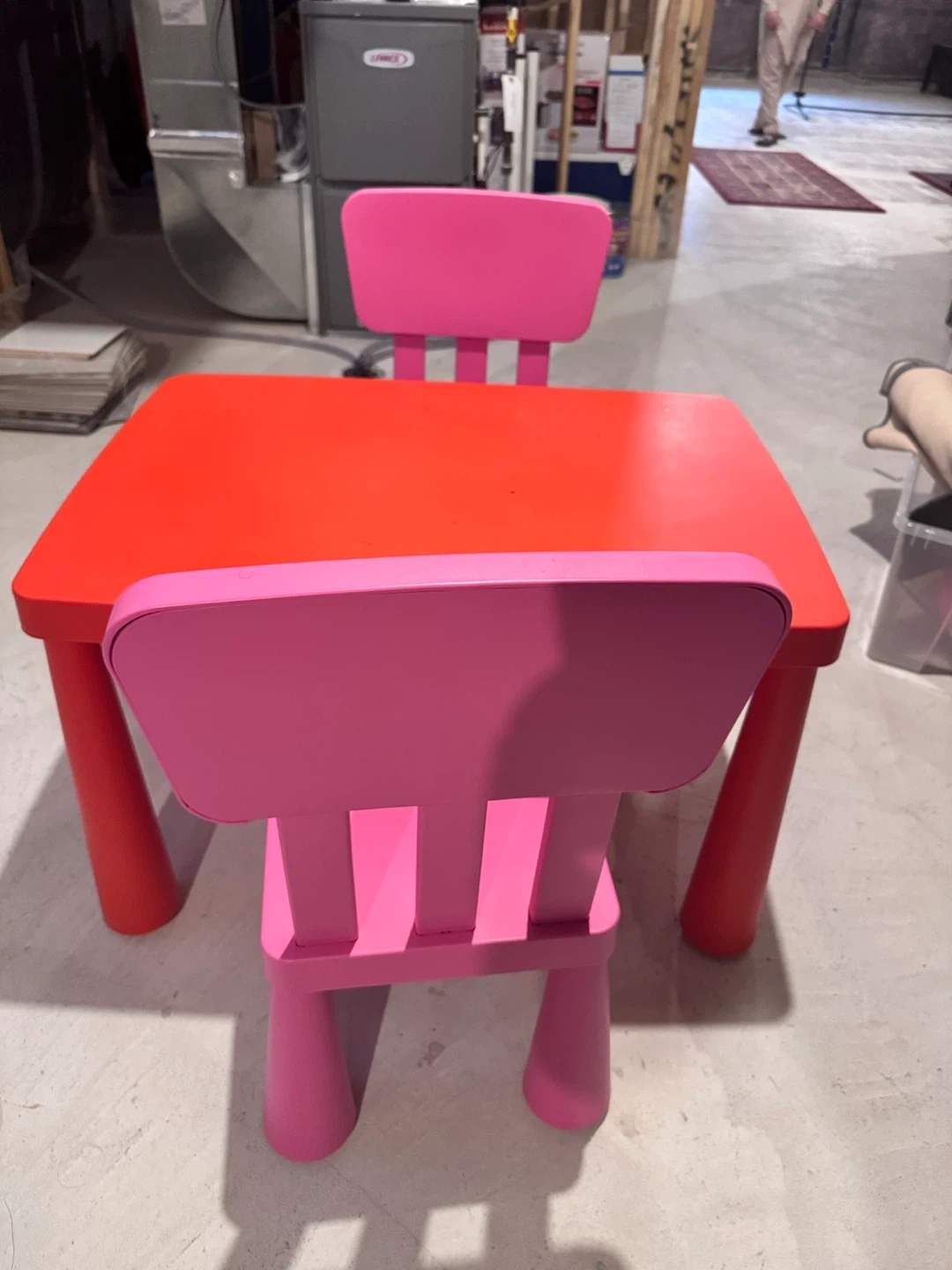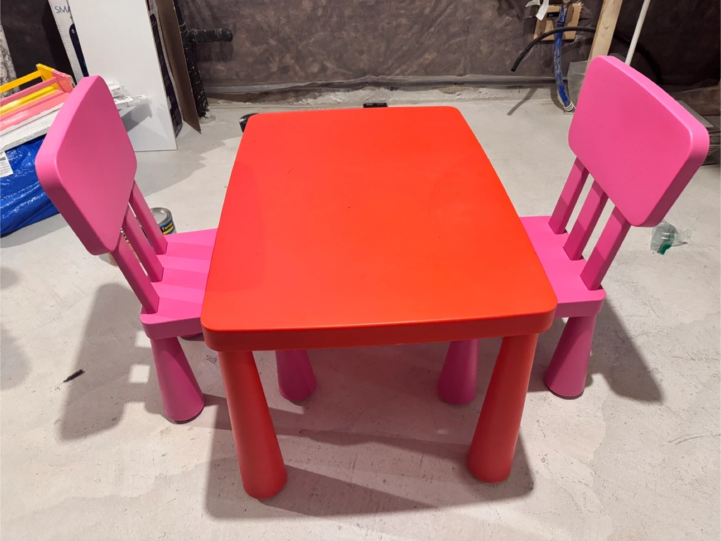 Selling a gently used IKEA Mammut kids table with two matching chairs. The table is red and the chairs are pink. Perfect for arts and crafts, snack time, or homework!