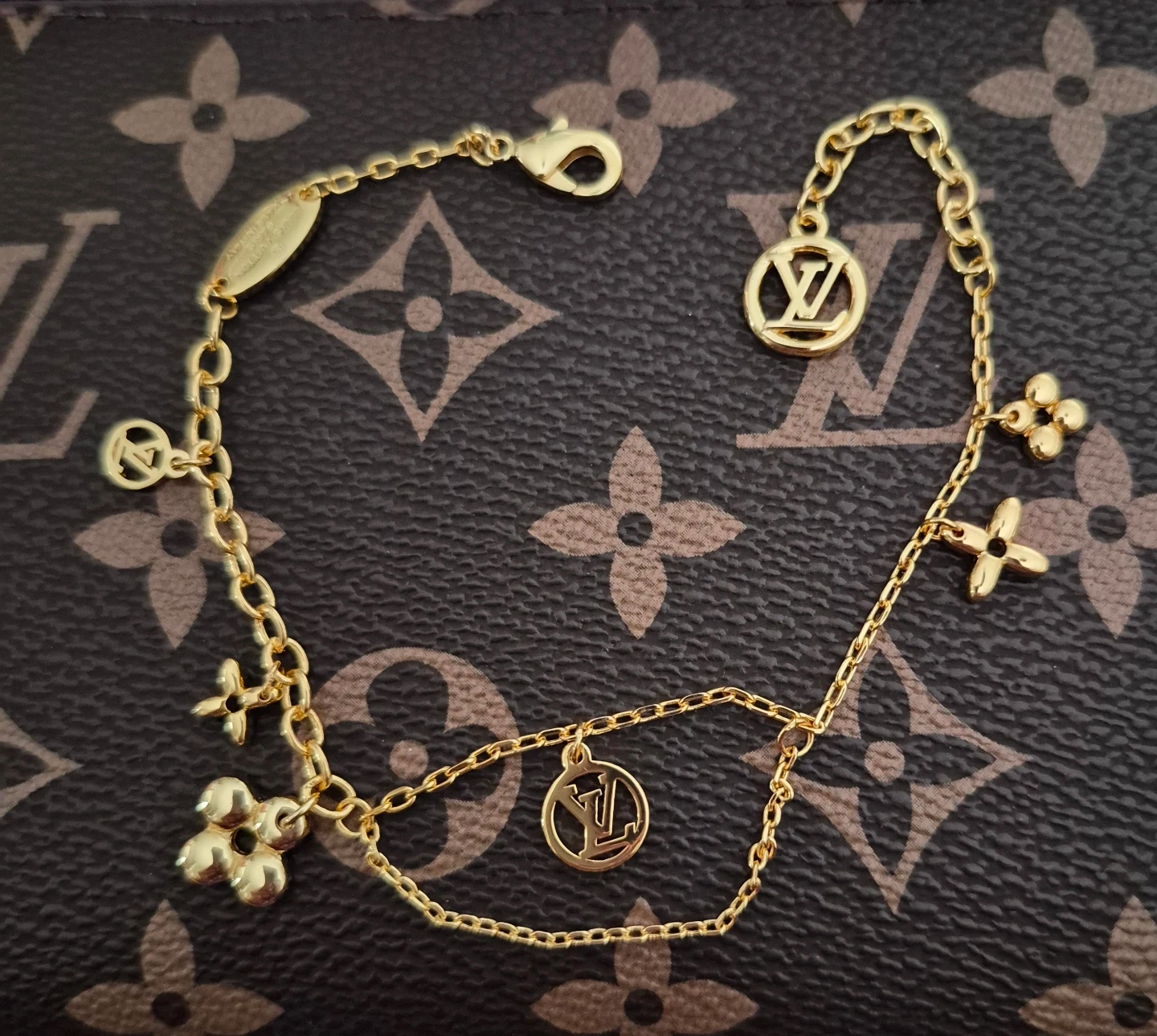 This is a beautiful Louis Vuitton gold charm bracelet. It's in great condition and features the iconic LV logo and flower charms. A stylish accessory to elevate any outfit!