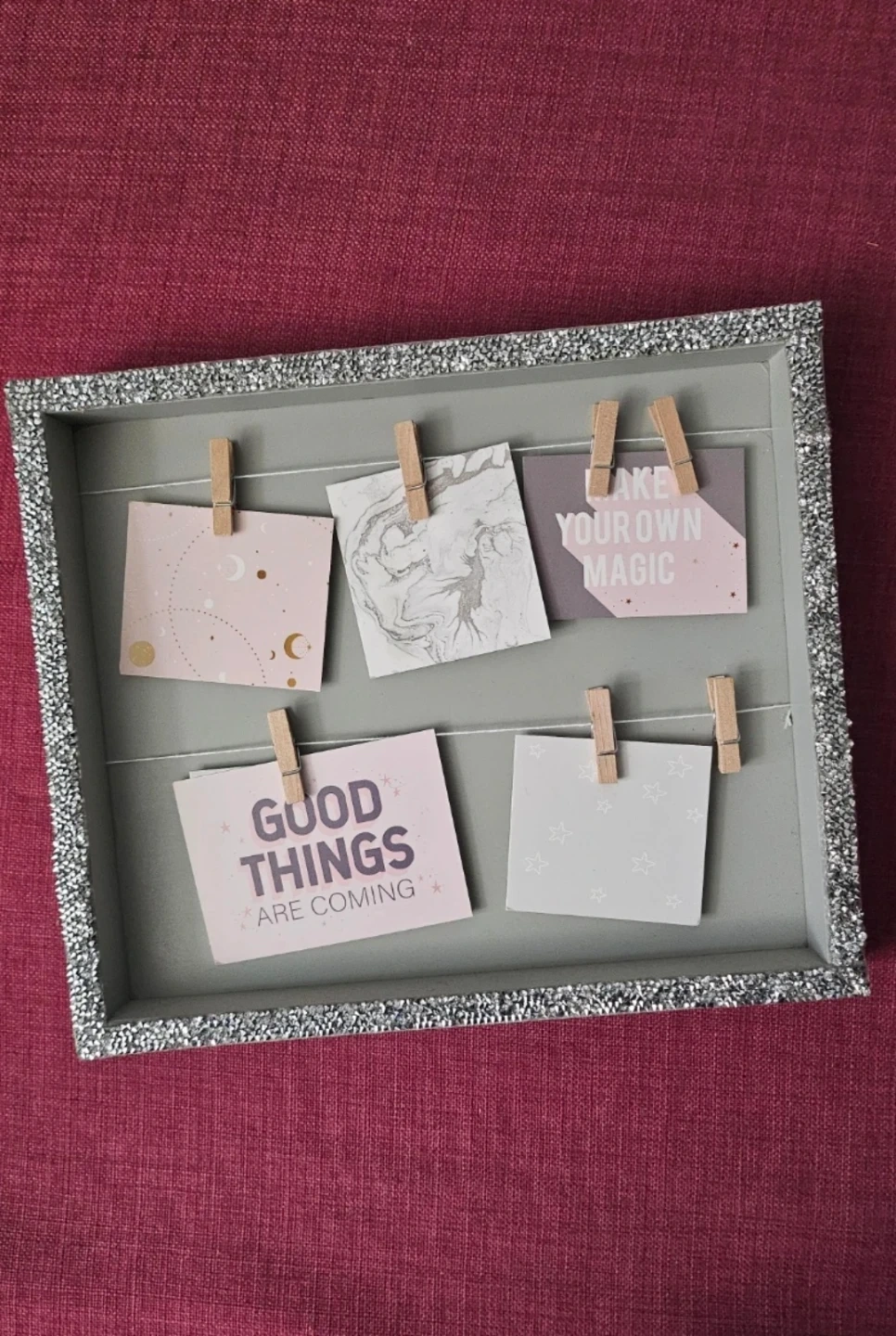 It has a sparkly frame and little clothespins to hang your favourite photos or notes, or even your small figurines.