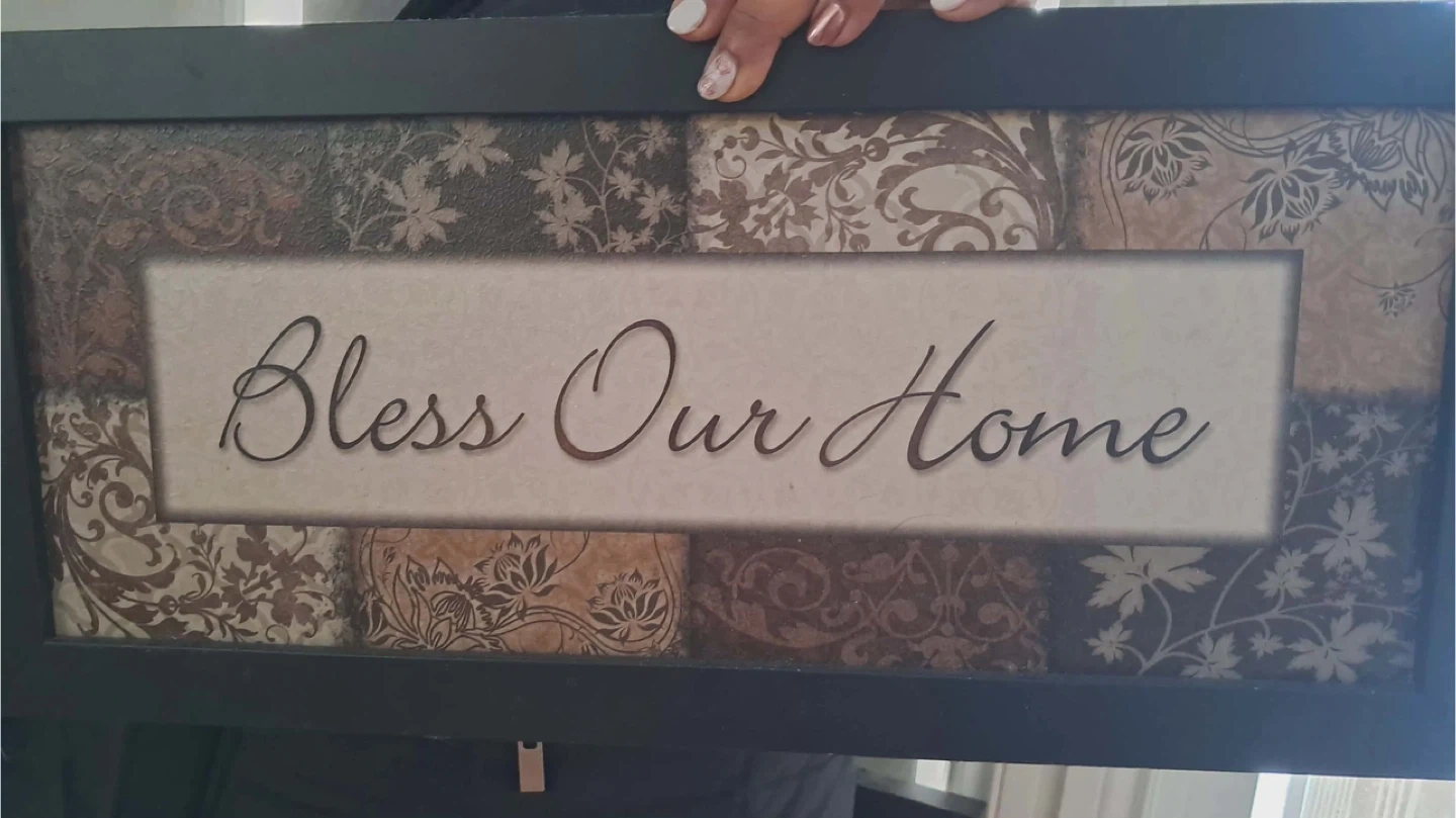 A lovely framed piece of wall art that reads "Bless Our Home" in a decorative font. The frame is a dark colour, and the background features a floral pattern. This would be a great addition to any room!