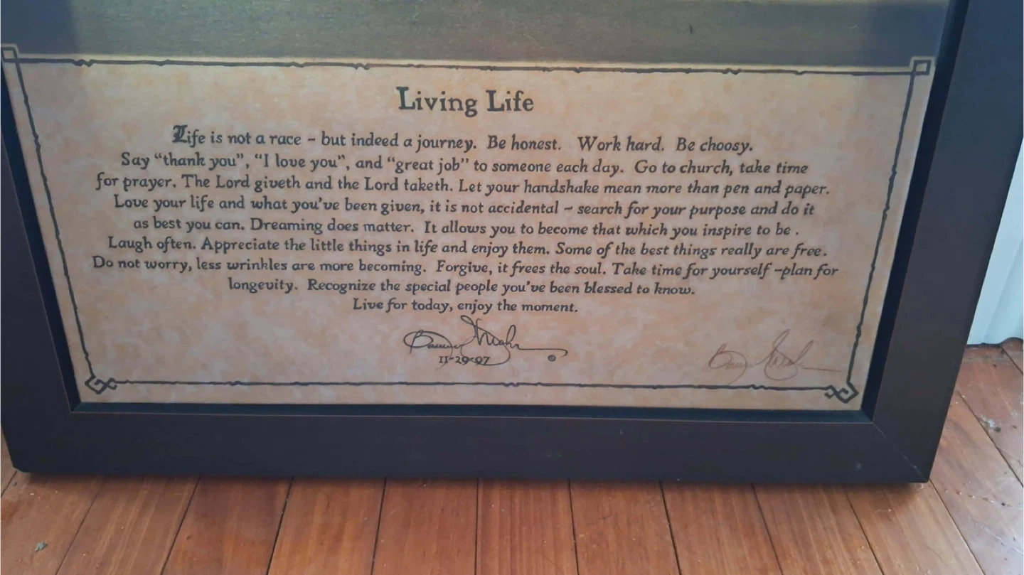 Framed print with the words 'Living Life'. It has an inspirational message about enjoying life and being thankful. The print is signed and dated 11-29-07