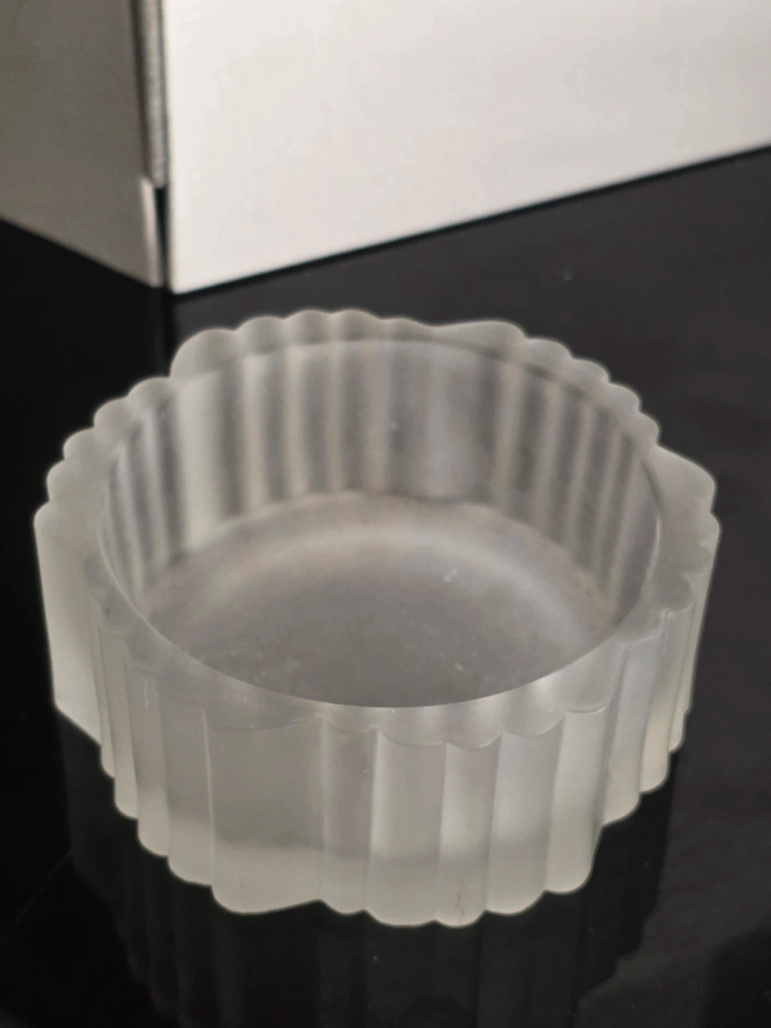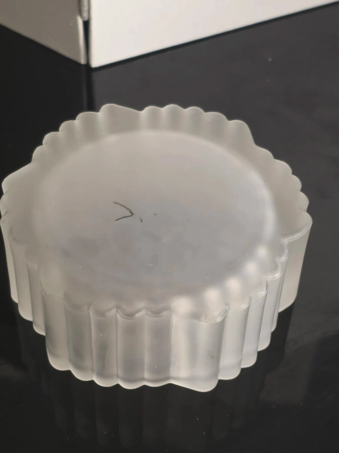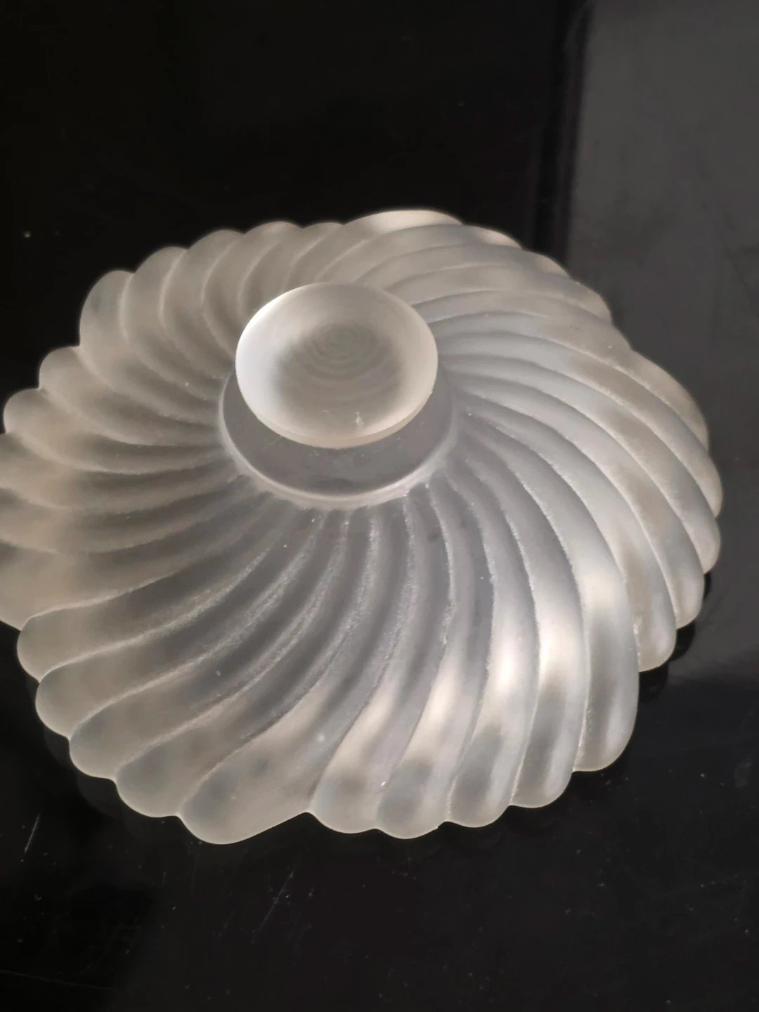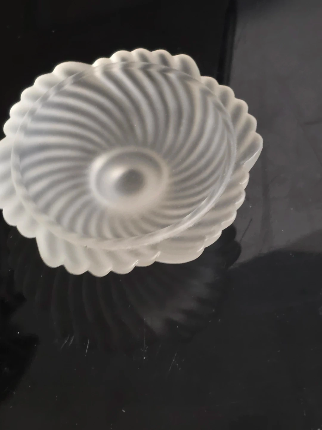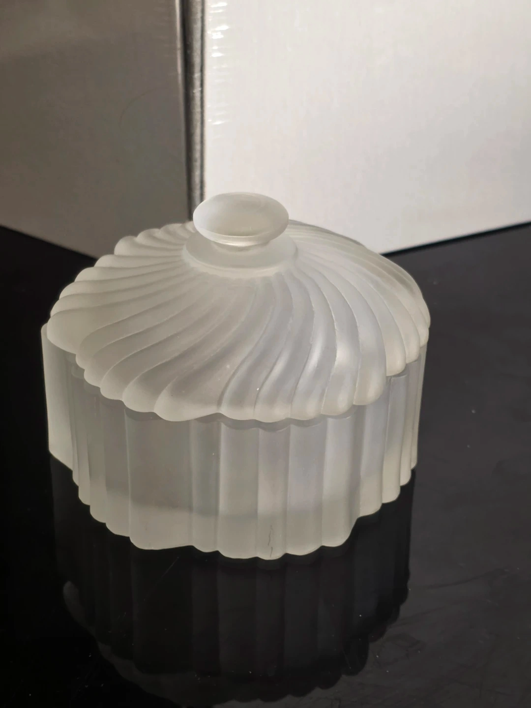 The item is made of frosted or satin glass with a distinct swirled or wave pattern on the lid and a scalloped edge on the base.