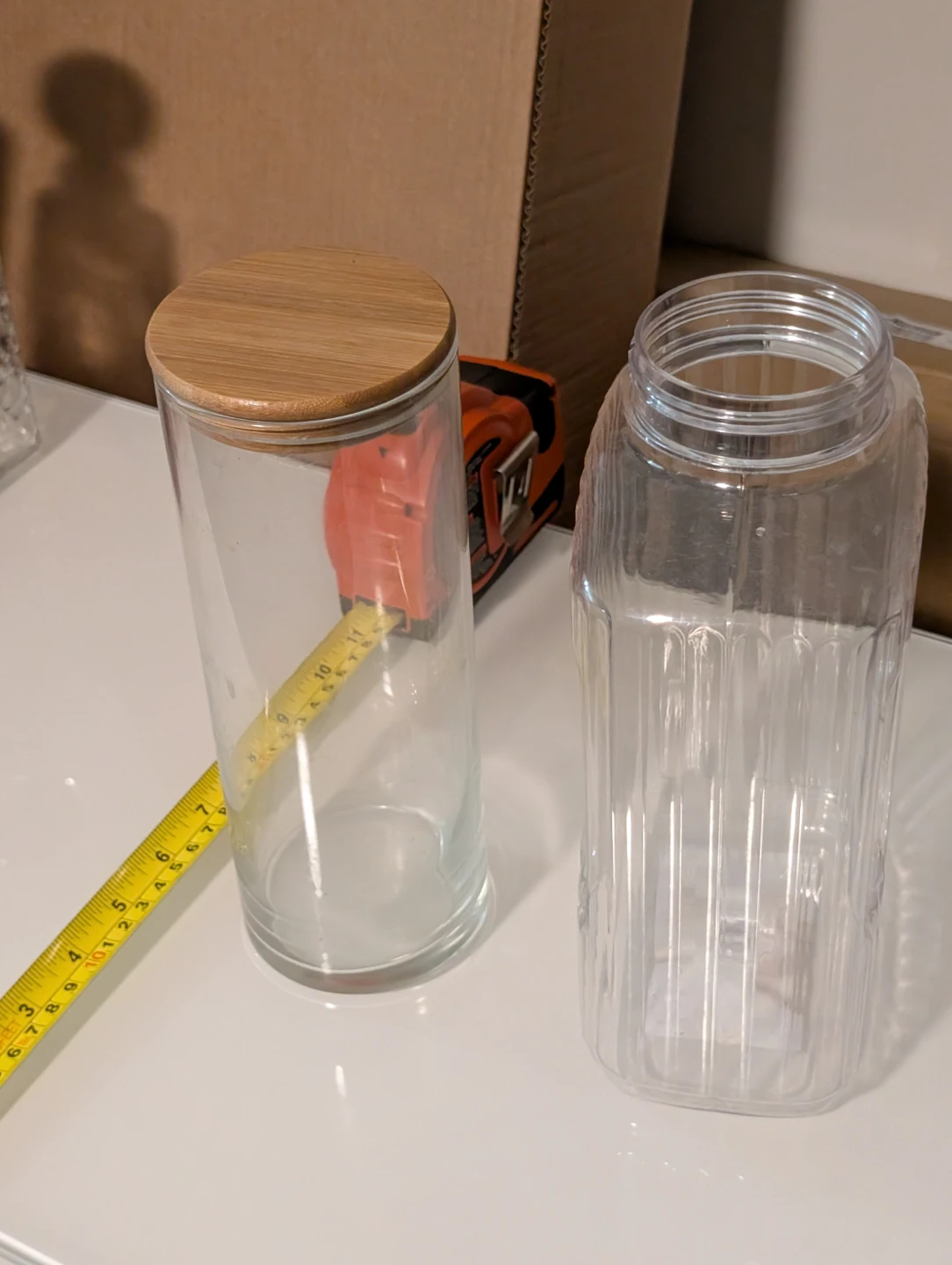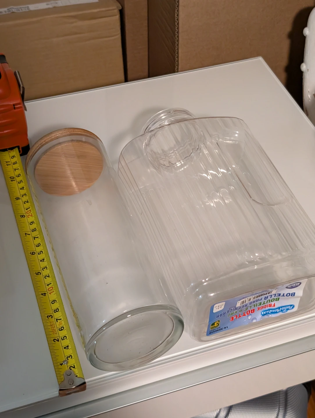 Selling Anchor Hocking glass storage jars. One is round with a wooden lid, and the other is a plastic rectangular bottle shape. Great for pantry storage!
