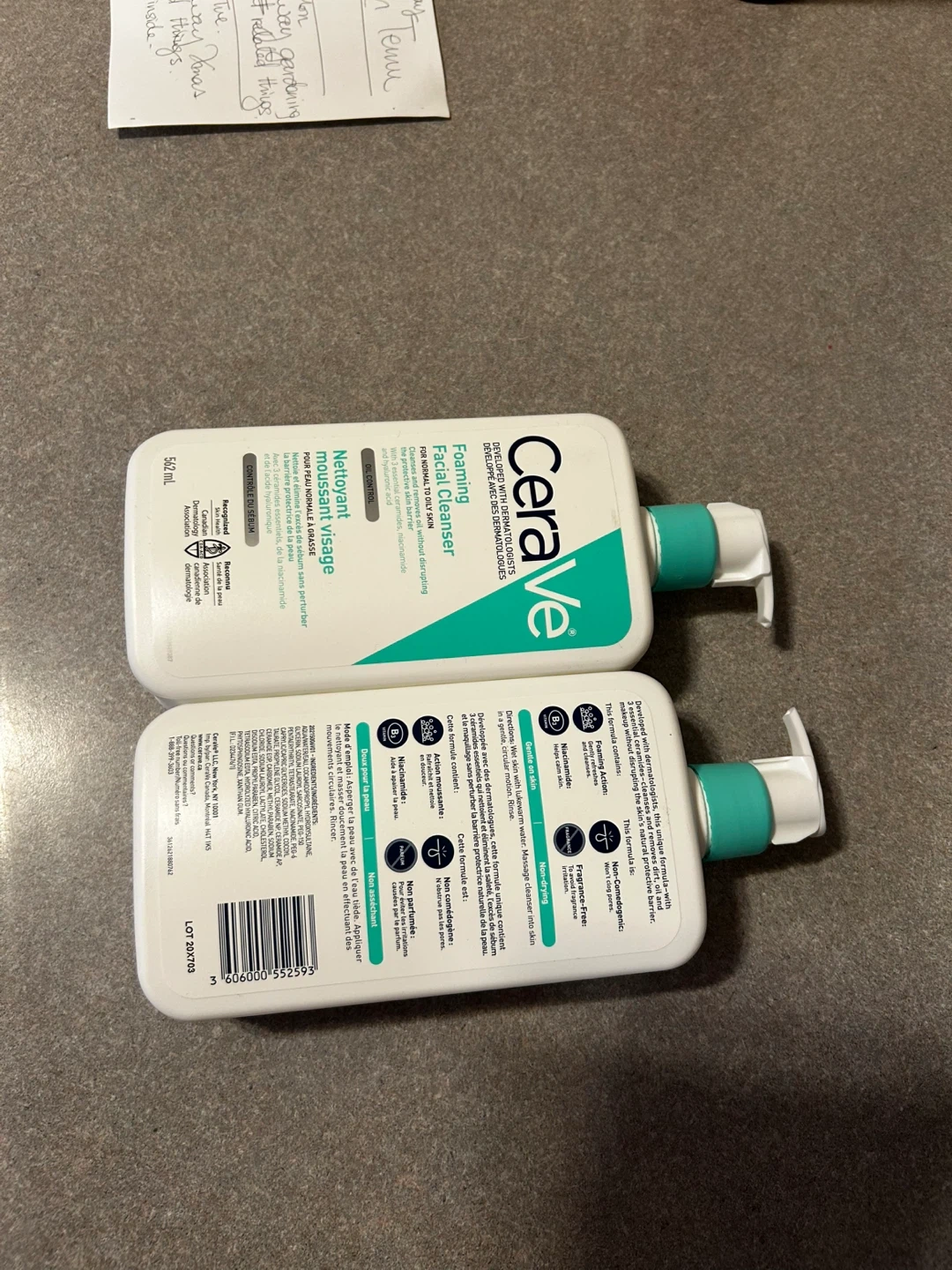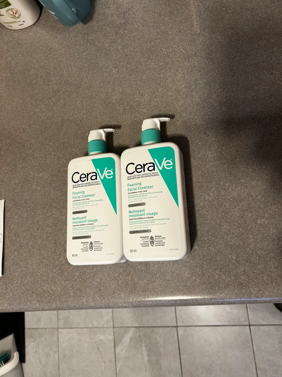 Selling two bottles of CeraVe Foaming Facial Cleanser. Each bottle contains 562 mL of cleanser. Perfect for normal to oily skin, this cleanser effectively removes dirt and oil without disrupting the skin's natural barrier