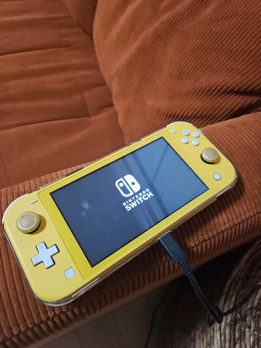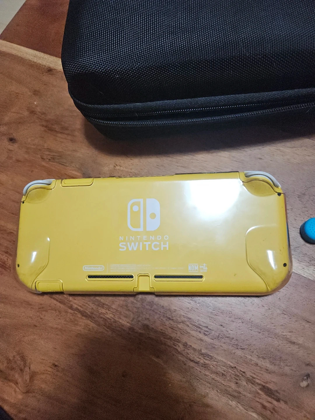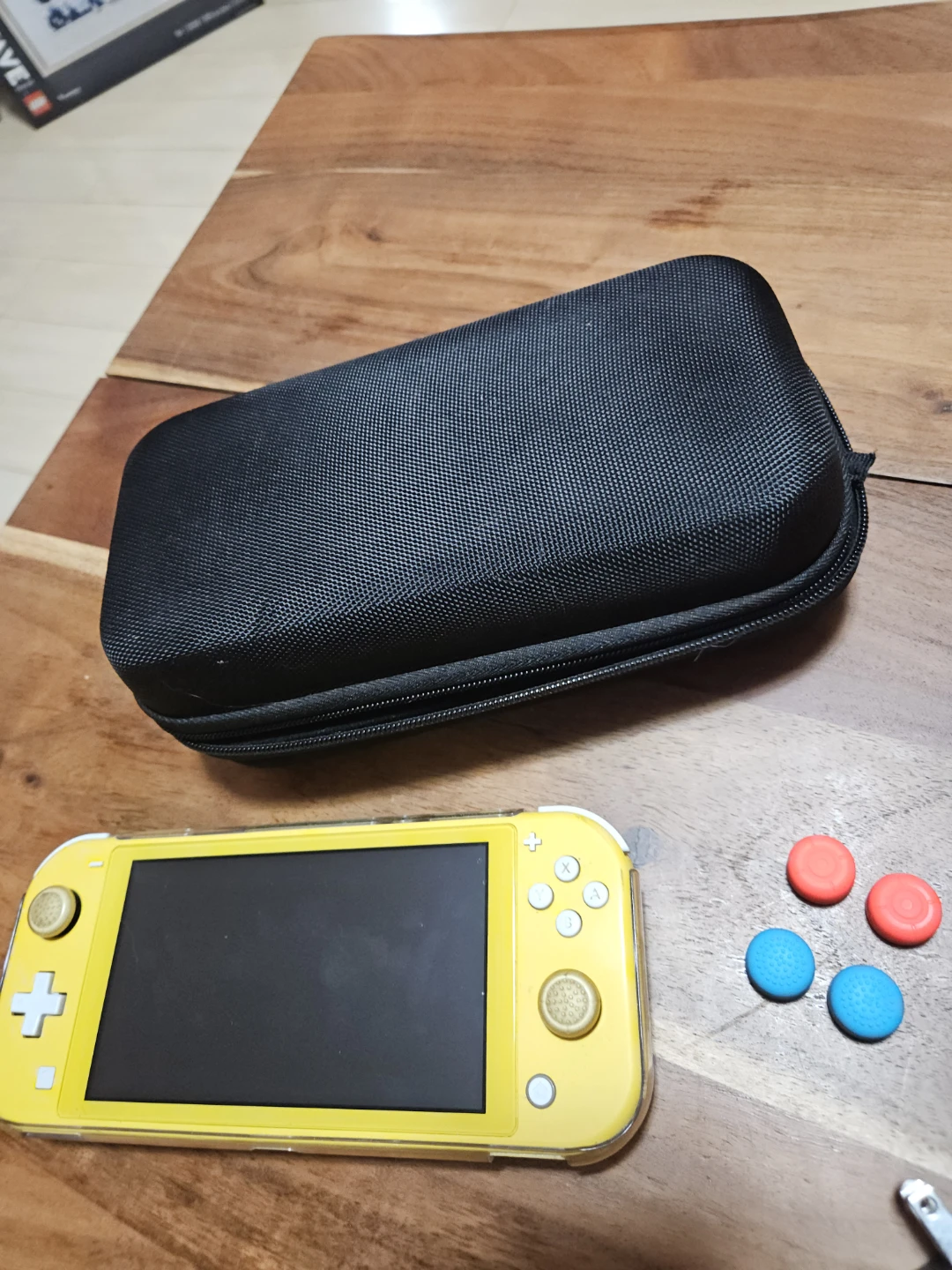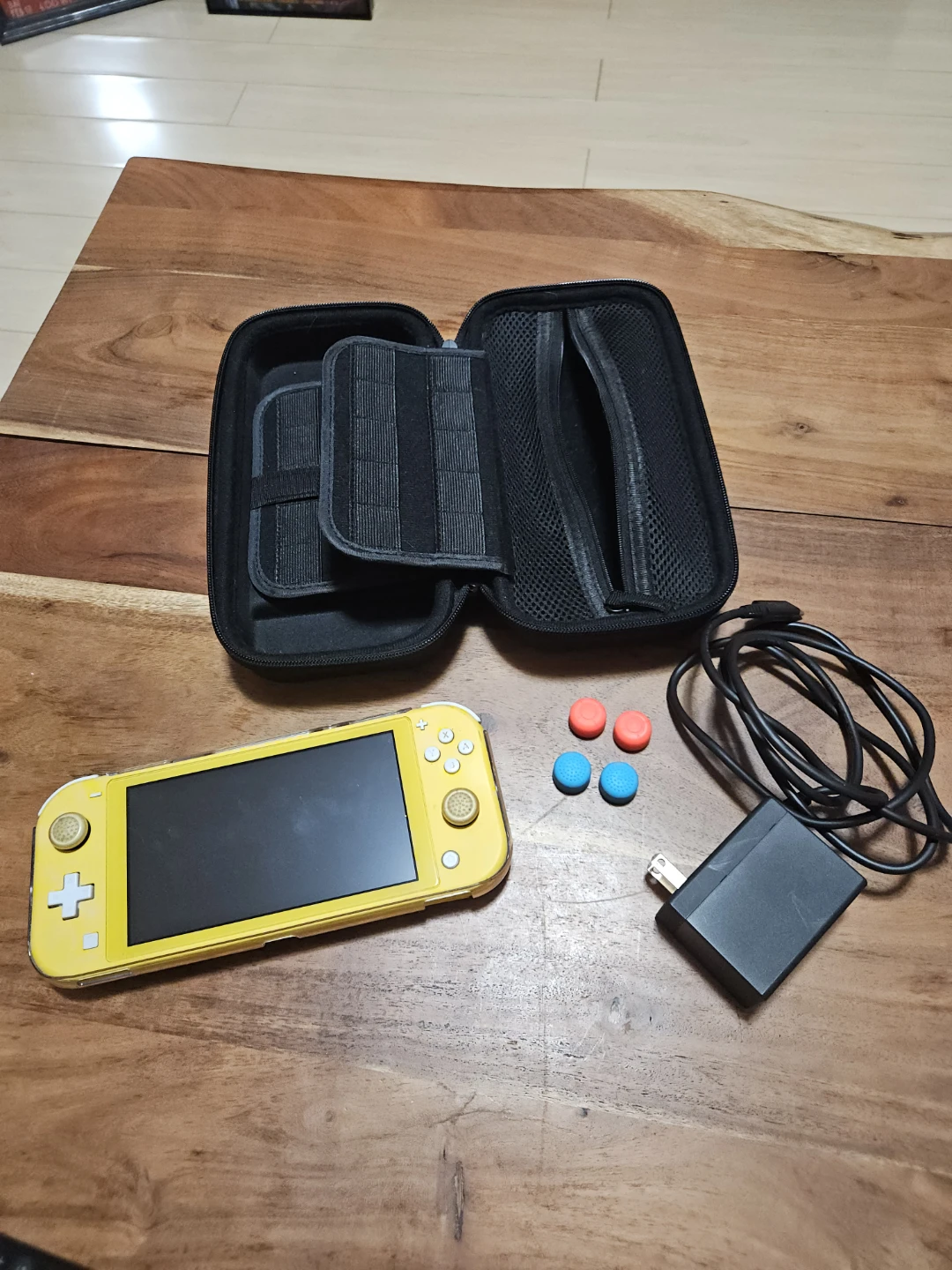 Comes with screen protector and clear shell case (currently on it and it has never been used without them); three sets of joystick caps, its charger, and a carrying case with pockets for charger and game cartridges.