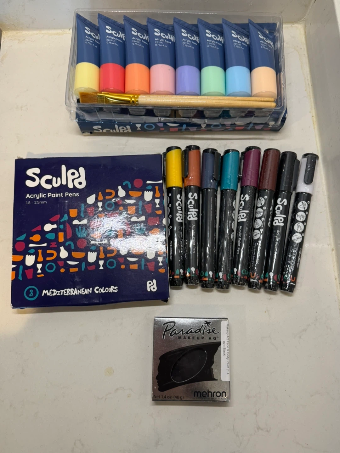 Selling a set of Sculpd acrylic paints, including tubes and pens, both brand new! Also included is a Paradise Makeup AQ face and body paint in black. Perfect for your next art project or costume!